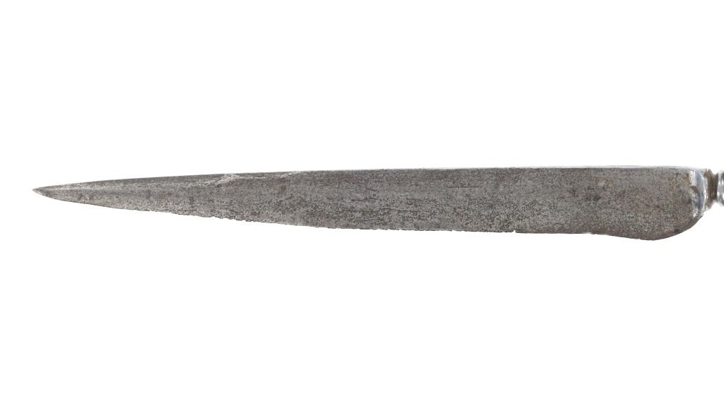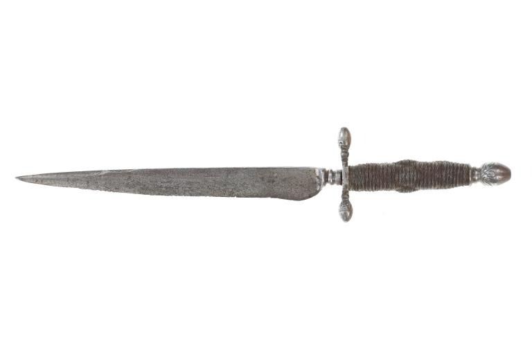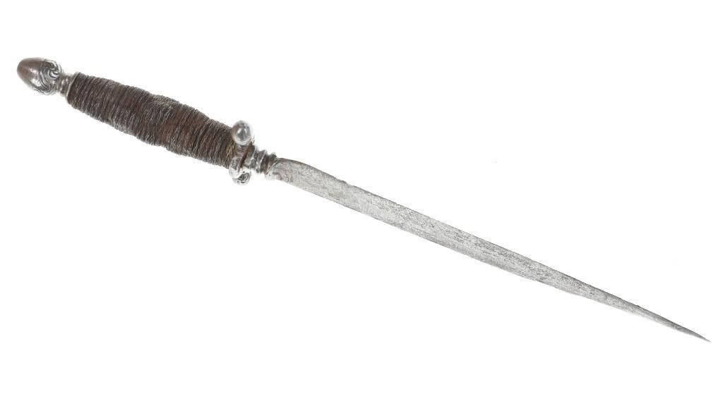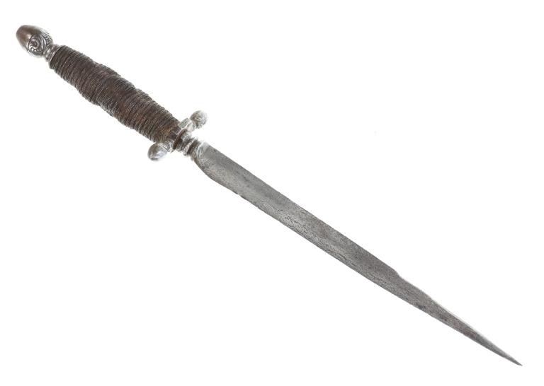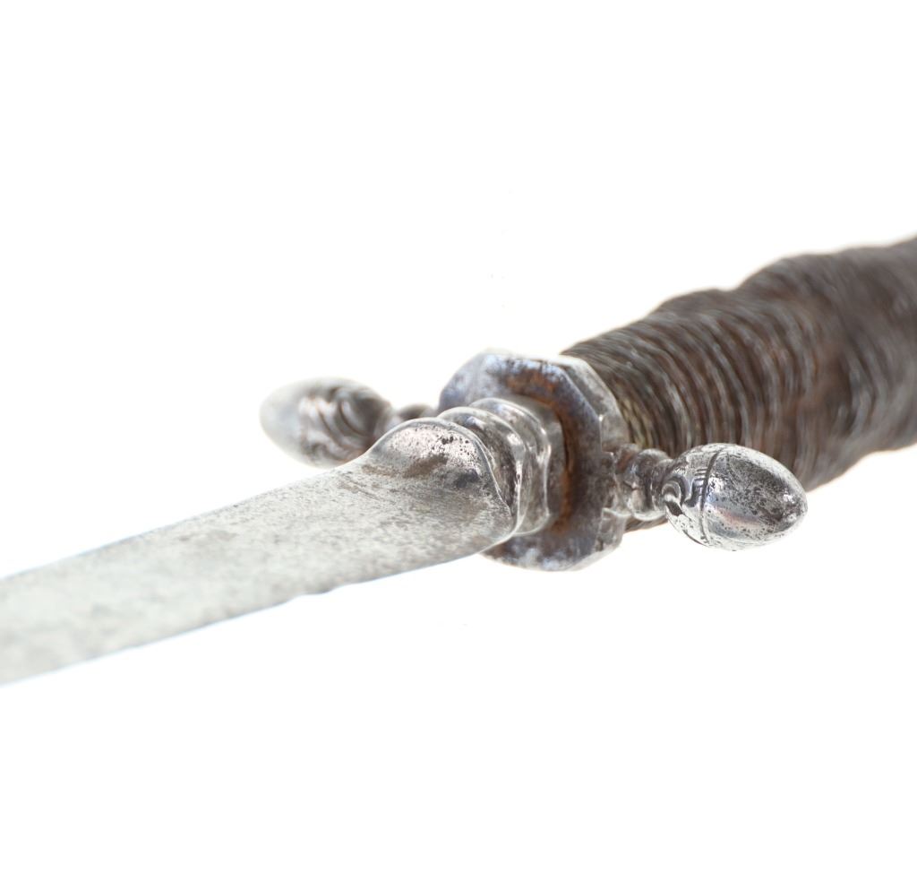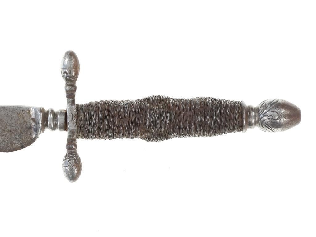 This is a fabulous parrying or "left hand" dagger knife from the 17th century Germans. The piece shows a forged metal blade with long slender shape and pointed tip having an expertly forged fuller on the spine and finely made ricasso / hilt connection. The guard shows a classic German acorn design with finely woven wire wrapped gripping area having a unique spiral like ribbed design. The pommel bottom also shows an acorn design and beautiful engravings. Measures overall 13 3/8-inches long by 2 5/8-inches width at the hilt.