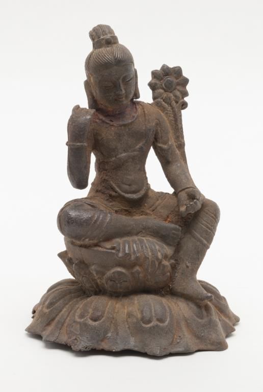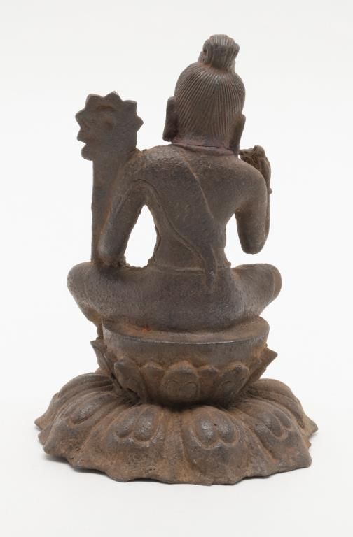 17th to 18th century cast bronze and iron deity probably of Buddha on Lotus petal with letter of authentication from curator of Meili Museum Larry Kirkwood dating and identifying this casting to the area of Cambodia. The metal surfaces show some pitting and rust and a deep un-cleaned patina. Est.: $300-$600