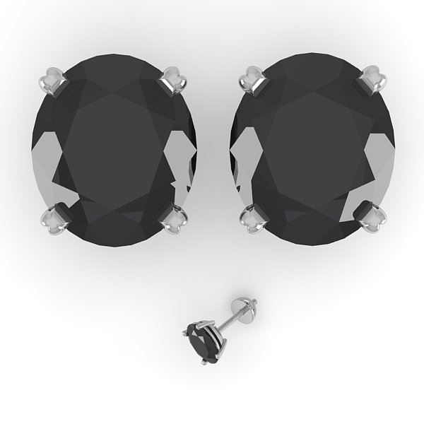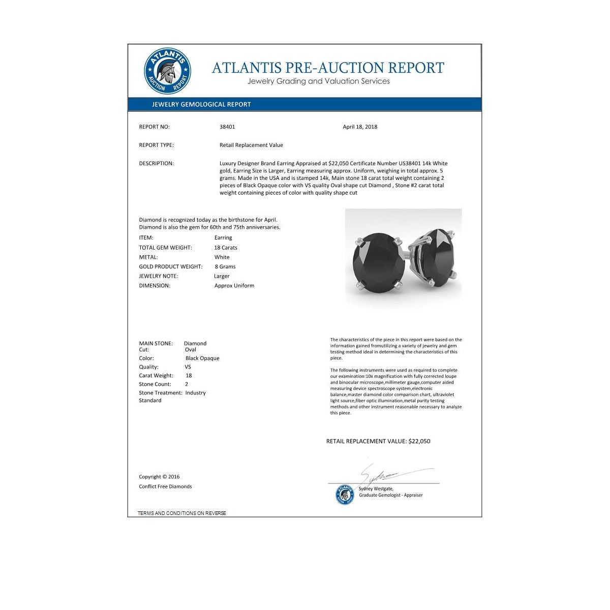 REF-364W5F -38401 ---- 18.0 CTW Oval Black Diamond Stud Designer Earrings 14K White Gold ---- Luxury Designer Brand Earring Appraised at $22,050 Certificate Number US38401 14k White gold, Earring Size is Larger, Earring measuring approx. Uniform, weighing in total approx. 5 grams. Made in the USA and is stamped 14k, Main stone 18 carat total weight containing 2 pieces of Black Opaque color with VS quality Oval shape cut Diamond , Stone #2 carat total weight containing pieces of color with quality shape cut