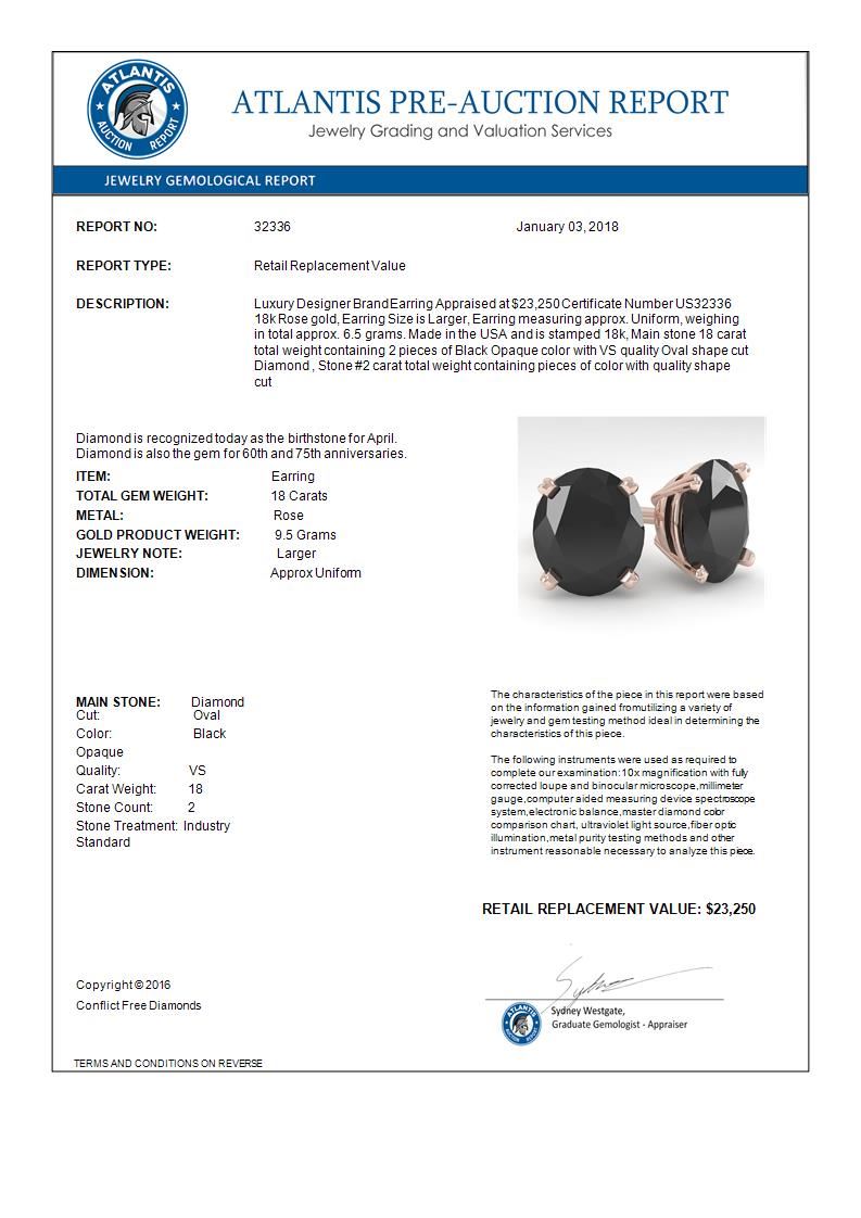 REF-384H5A -32336 ---- 18.0 CTW Oval Black Diamond Stud Designer Earrings 18K Rose Gold ---- Luxury Designer Brand Earring Appraised at $23,250 Certificate Number US32336 18k Rose gold, Earring Size is Larger, Earring measuring approx. Uniform, weighing in total approx. 6.5 grams. Made in the USA and is stamped 18k, Main stone 18 carat total weight containing 2 pieces of Black Opaque color with VS quality Oval shape cut Diamond , Stone #2 carat total weight containing pieces of color with quality shape cut