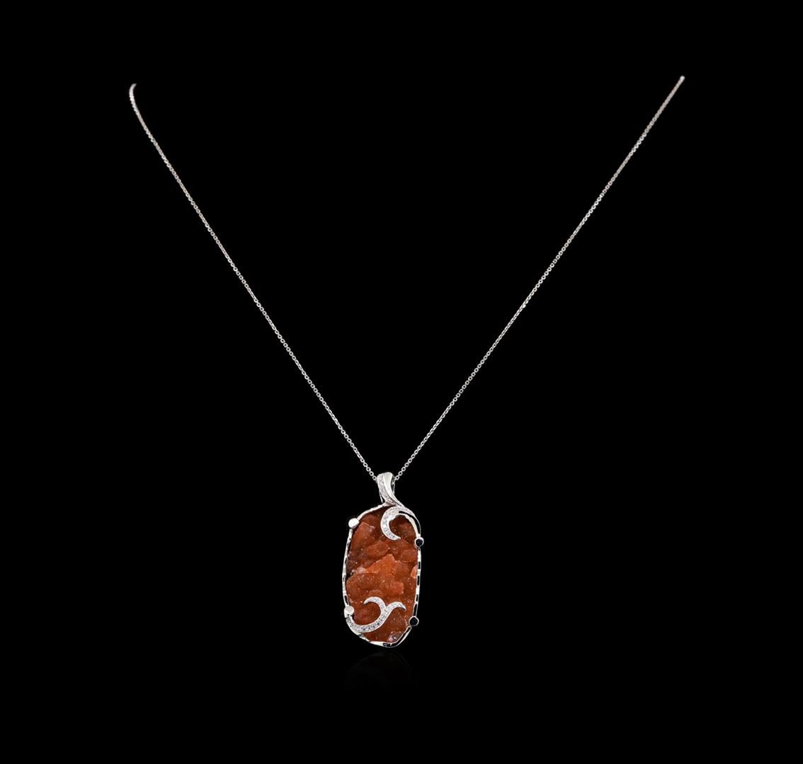 One electronically tested 14KT white gold lady's cast fashion pendant & chain 18.0' long, 1mm diamond cut oval cable link with a spring ring clasp with a bright polish finish. Identified with markings of '14K'. Condition is new, good workmanship. Containing: One free-form cut natural citrine quartz, measuring 30.00 x 15.00 x 4.00mm, (depth est.) approximate weight of 18.00ct.The featured citrine quartz has a brownish orange hue and contains crystalline structures. Graded in the setting. Thirty-Five bead set round brilliant cut diamonds, measuring 1.30 - 1.20 x 0.78mm (depth est.) approximate total weight of 35 Stones = 0.26ct. Graded in the setting. Clarity SI-1 to SI-2. Color: G - H Cut Good. Total Weight of Colored Stones 18.00ct.. Total Weight of Diamonds 0.26ct.. Total Weight of Pendant & Chain 8.60gm. GAS Appraised at $2,950.00.