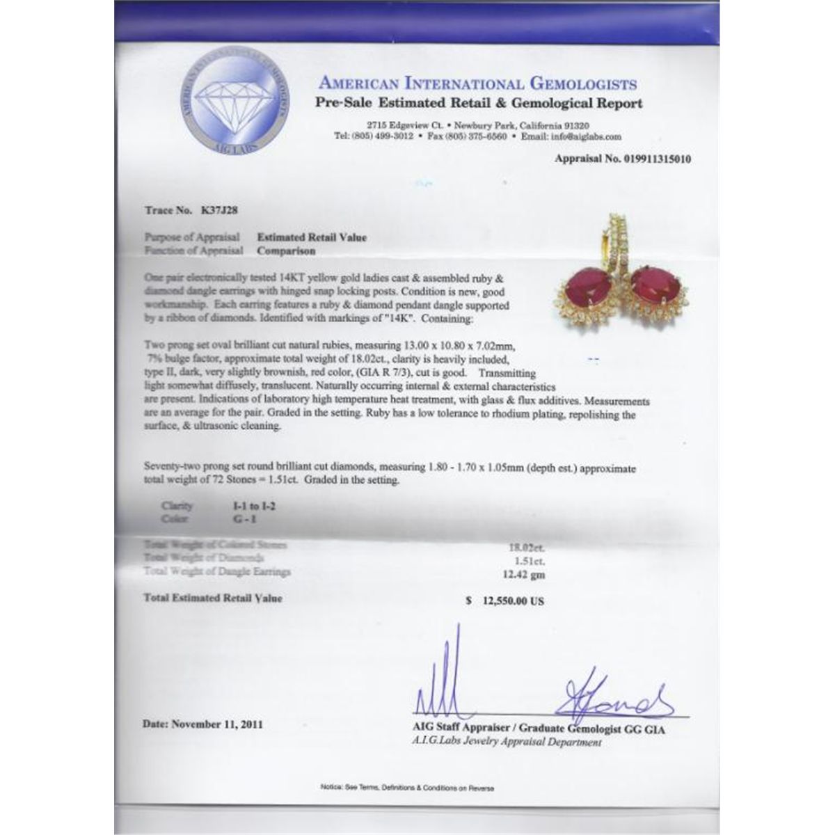 A super high grade ruby gemstone earring set. These fabulous items have a full page appraisal value of $ 12,550.00. They are a magnificent investment opportunity.