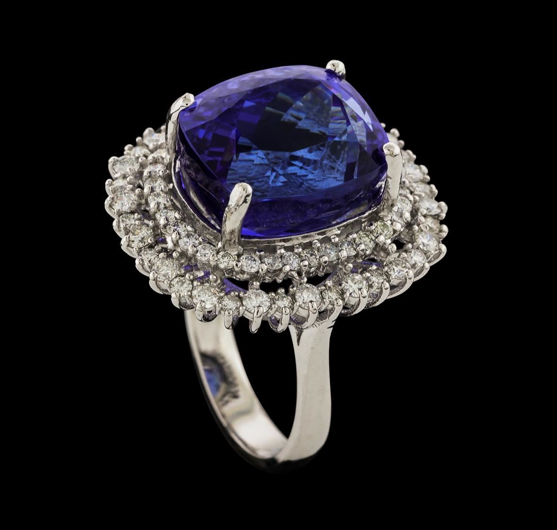 One electronically tested 14KT white gold lady's cast fashion ring with a staggered double basket halo with a bright polish finish. The featured lady's ring has a shank measuring 3.41 millimeters wide. Identified with markings of 'K14'. Condition is new, good workmanship. Containing: One prong set rectangular cushion modified brilliant cut natural tanzanite, measuring 14.22 x 12.27 x 11.26mm, (depth est.) 17%. bulge factor, approximate weight of 18.03ct., clarity is eye clean, medium dark, moderately strong, violetish blue color, (GIA vB 6/4), cut is good. Transmitting light with no distortion, transparent. Colored gemstones are presumed to have been subjected to commonly used enhancement processes. Graded in the setting. Eighteen prong set round brilliant cut diamonds, measuring 2.00 - 1.90 x 1.17mm (depth est.) approximate total weight of 18 Stones = 0.48ct. Graded in the setting. Clarity SI-1 to SI-2. Color: H - I Cut Good Fifty-Two prong set round brilliant cut diamonds, measuring 1.60 - 1.50 x 0.96mm (depth est.) approximate total weight of 52 Stones = 0.74ct. Graded in the setting. Clarity SI-1 to SI-2. Color: G - H Cut Good. Total Weight of Colored Stones 18.03ct.. Total Weight of Diamonds 1.22ct.. Total Weight of Ring 10.90gm. GAS Appraised at $20,070.00.