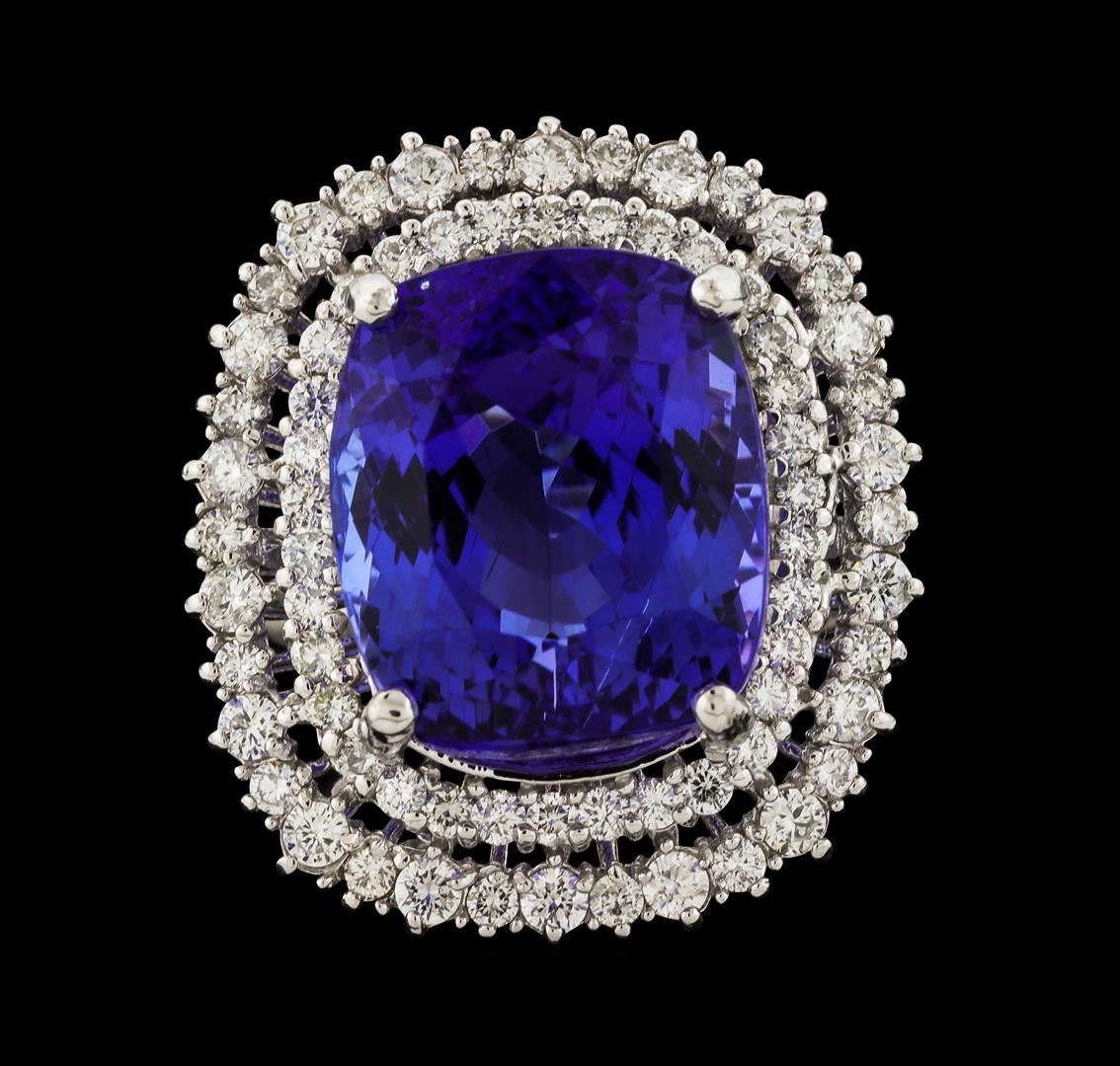 One electronically tested 14KT white gold lady's cast fashion ring with a staggered double basket halo with a bright polish finish. The featured lady's ring has a shank measuring 3.41 millimeters wide. Identified with markings of 'K14'. Condition is new, good workmanship. Containing: One prong set rectangular cushion modified brilliant cut natural tanzanite, measuring 14.22 x 12.27 x 11.26mm, (depth est.) 17%. bulge factor, approximate weight of 18.03ct., clarity is eye clean, medium dark, moderately strong, violetish blue color, (GIA vB 6/4), cut is good. Transmitting light with no distortion, transparent. Colored gemstones are presumed to have been subjected to commonly used enhancement processes. Graded in the setting. Eighteen prong set round brilliant cut diamonds, measuring 2.00 - 1.90 x 1.17mm (depth est.) approximate total weight of 18 Stones = 0.48ct. Graded in the setting. Clarity SI-1 to SI-2. Color: H - I Cut Good Fifty-Two prong set round brilliant cut diamonds, measuring 1.60 - 1.50 x 0.96mm (depth est.) approximate total weight of 52 Stones = 0.74ct. Graded in the setting. Clarity SI-1 to SI-2. Color: G - H Cut Good. Total Weight of Colored Stones 18.03ct.. Total Weight of Diamonds 1.22ct.. Total Weight of Ring 10.90gm. GAS Appraised at $20,070.00.