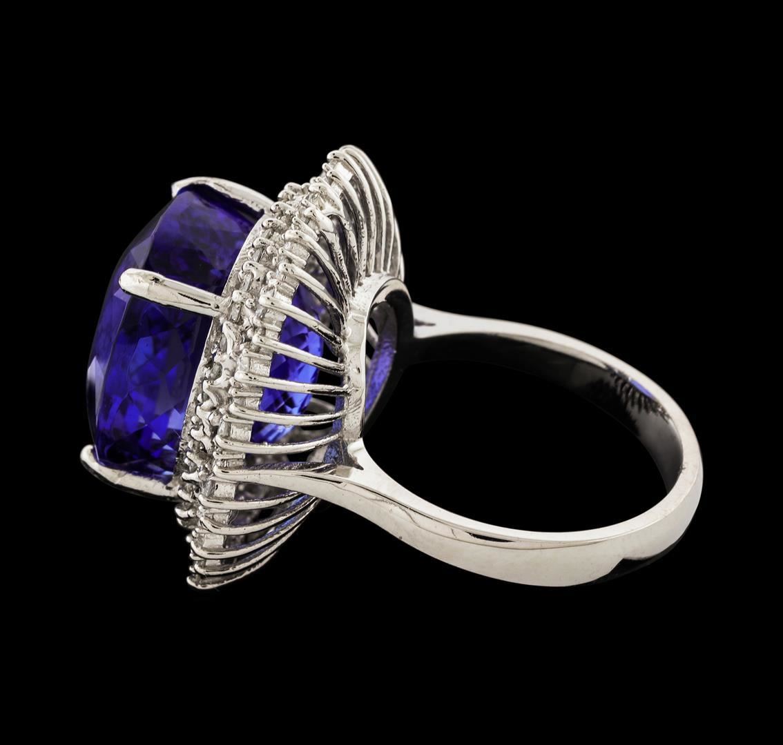 One electronically tested 14KT white gold lady's cast fashion ring with a staggered double basket halo with a bright polish finish. The featured lady's ring has a shank measuring 3.41 millimeters wide. Identified with markings of 'K14'. Condition is new, good workmanship. Containing: One prong set rectangular cushion modified brilliant cut natural tanzanite, measuring 14.22 x 12.27 x 11.26mm, (depth est.) 17%. bulge factor, approximate weight of 18.03ct., clarity is eye clean, medium dark, moderately strong, violetish blue color, (GIA vB 6/4), cut is good. Transmitting light with no distortion, transparent. Colored gemstones are presumed to have been subjected to commonly used enhancement processes. Graded in the setting. Eighteen prong set round brilliant cut diamonds, measuring 2.00 - 1.90 x 1.17mm (depth est.) approximate total weight of 18 Stones = 0.48ct. Graded in the setting. Clarity SI-1 to SI-2. Color: H - I Cut Good Fifty-Two prong set round brilliant cut diamonds, measuring 1.60 - 1.50 x 0.96mm (depth est.) approximate total weight of 52 Stones = 0.74ct. Graded in the setting. Clarity SI-1 to SI-2. Color: G - H Cut Good. Total Weight of Colored Stones 18.03ct.. Total Weight of Diamonds 1.22ct.. Total Weight of Ring 10.90gm. GAS Appraised.