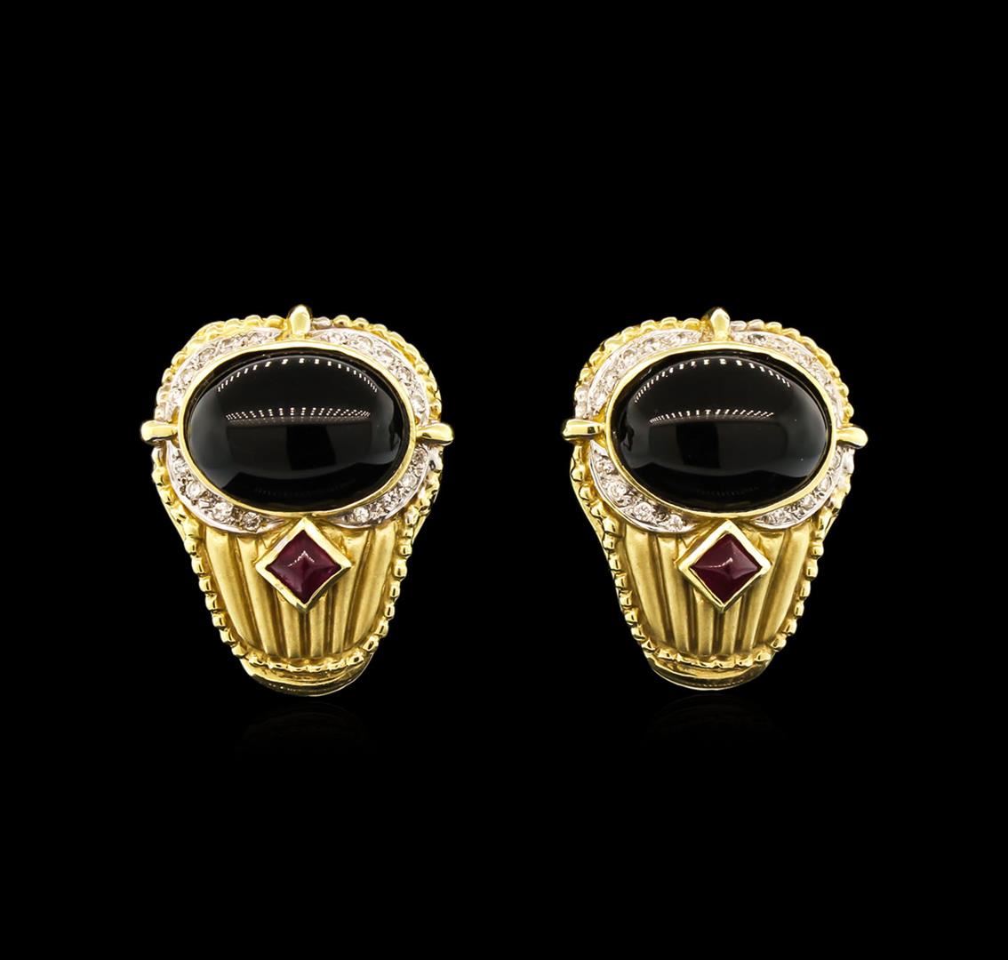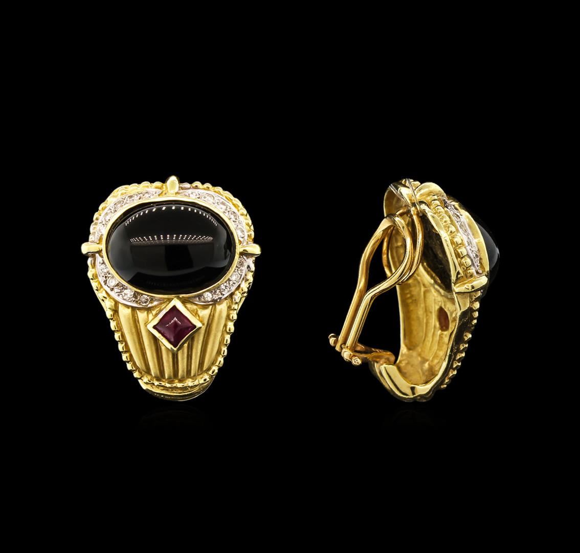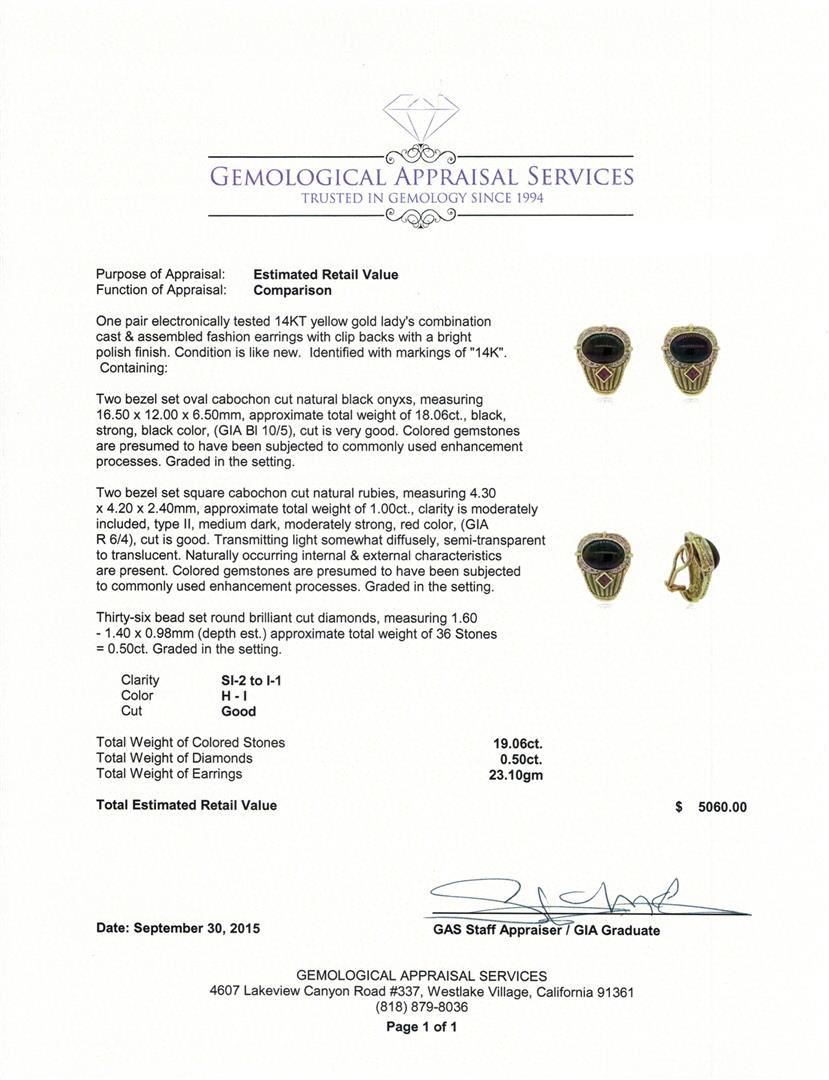 One pair electronically tested 14KT yellow gold lady's combination cast & assembled fashion earrings with clip backs with a bright polish finish. Identified with markings of "14K". Condition is like new. Containing: Two bezel set oval cabochon cut natural black onyxs, measuring 16.50 x 12.00 x 6.50mm, approximate total weight of 18.06ct., black, strong, black color, (GIA Bl 10/5), cut is very good. Colored gemstones are presumed to have been subjected to commonly used enhancement processes. Graded in the setting. Two bezel set square cabochon cut natural rubies, measuring 4.30 x 4.20 x 2.40mm, approximate total weight of 1.00ct., clarity is moderately included, type II, medium dark, moderately strong, red color, (GIA R 6/4), cut is good. Transmitting light somewhat diffusely, semi-transparent to translucent. Naturally occurring internal & external characteristics are present. Colored gemstones are presumed to have been subjected to commonly used enhancement processes. Graded in the setting. Thirty-Six bead set round brilliant cut diamonds, measuring 1.60 - 1.40 x 0.98mm (depth est.) approximate total weight of 36 Stones = 0.50ct. Graded in the setting. Clarity: SI-2 to I-1. Color: H - I. Cut Good. Total Weight of Colored Stones 19.06ct. Total Weight of Diamonds 0.50ct. Total Weight of Earrings 23.10gm. GAS Appraised at $5,060.00.