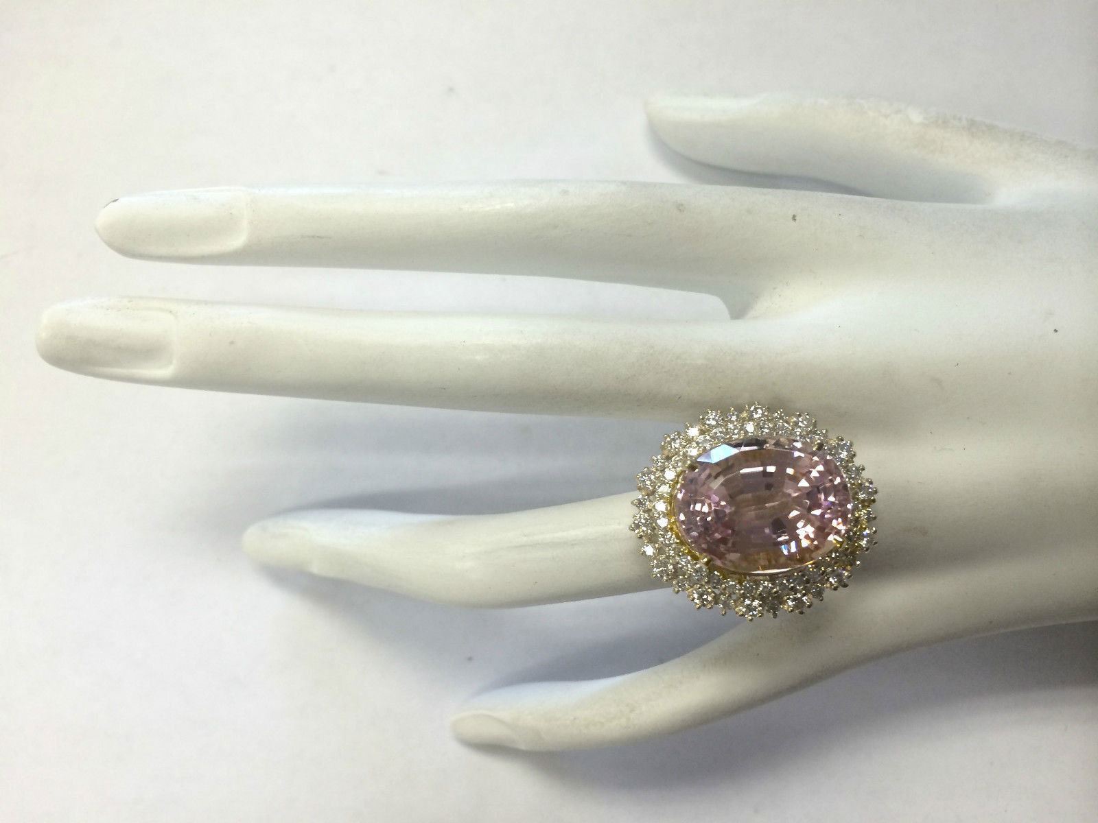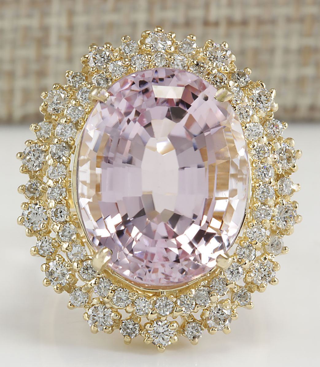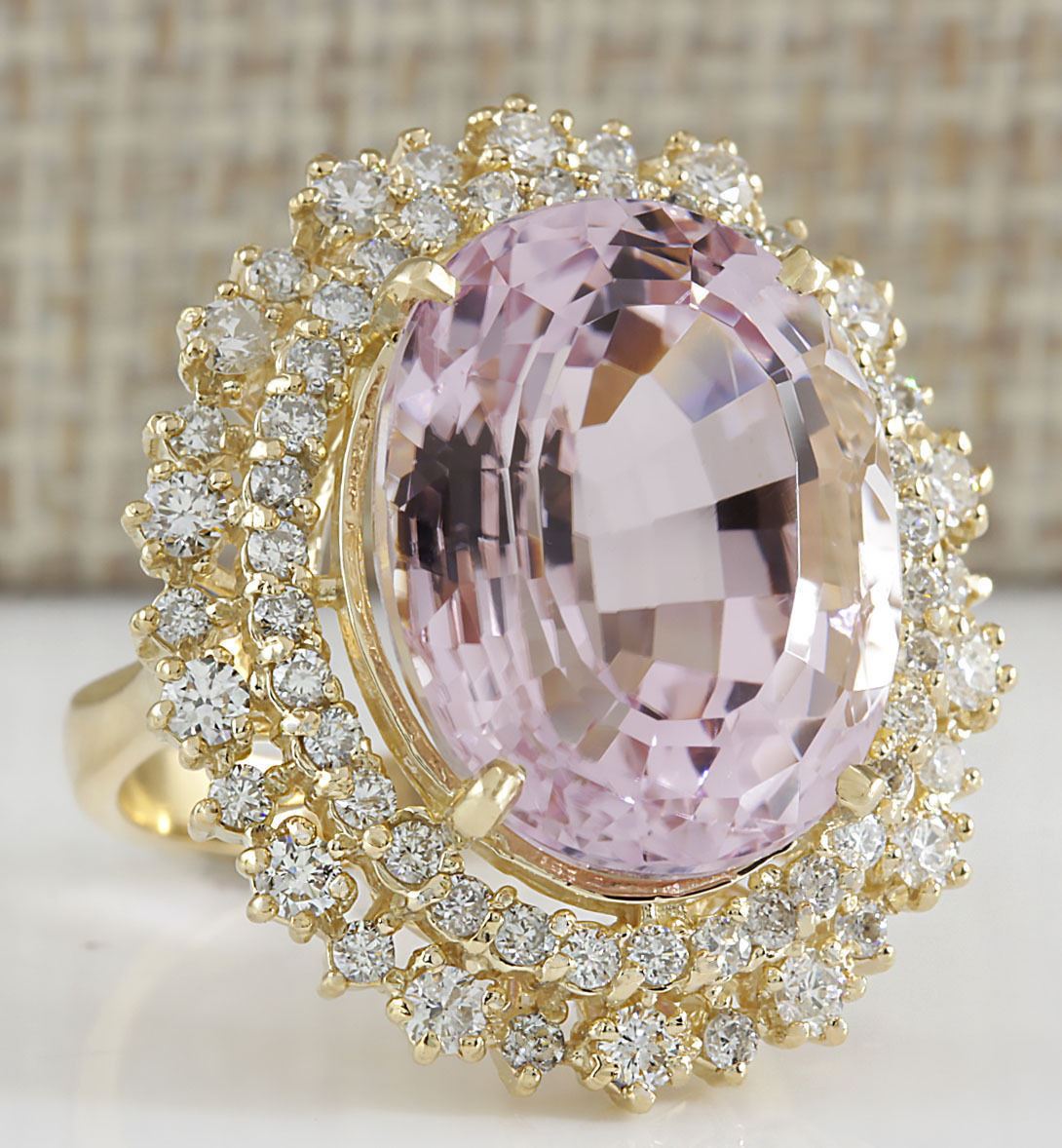 18.07 CTW Natural Kunzite And Diamond Ring 14K Solid Yellow Gold