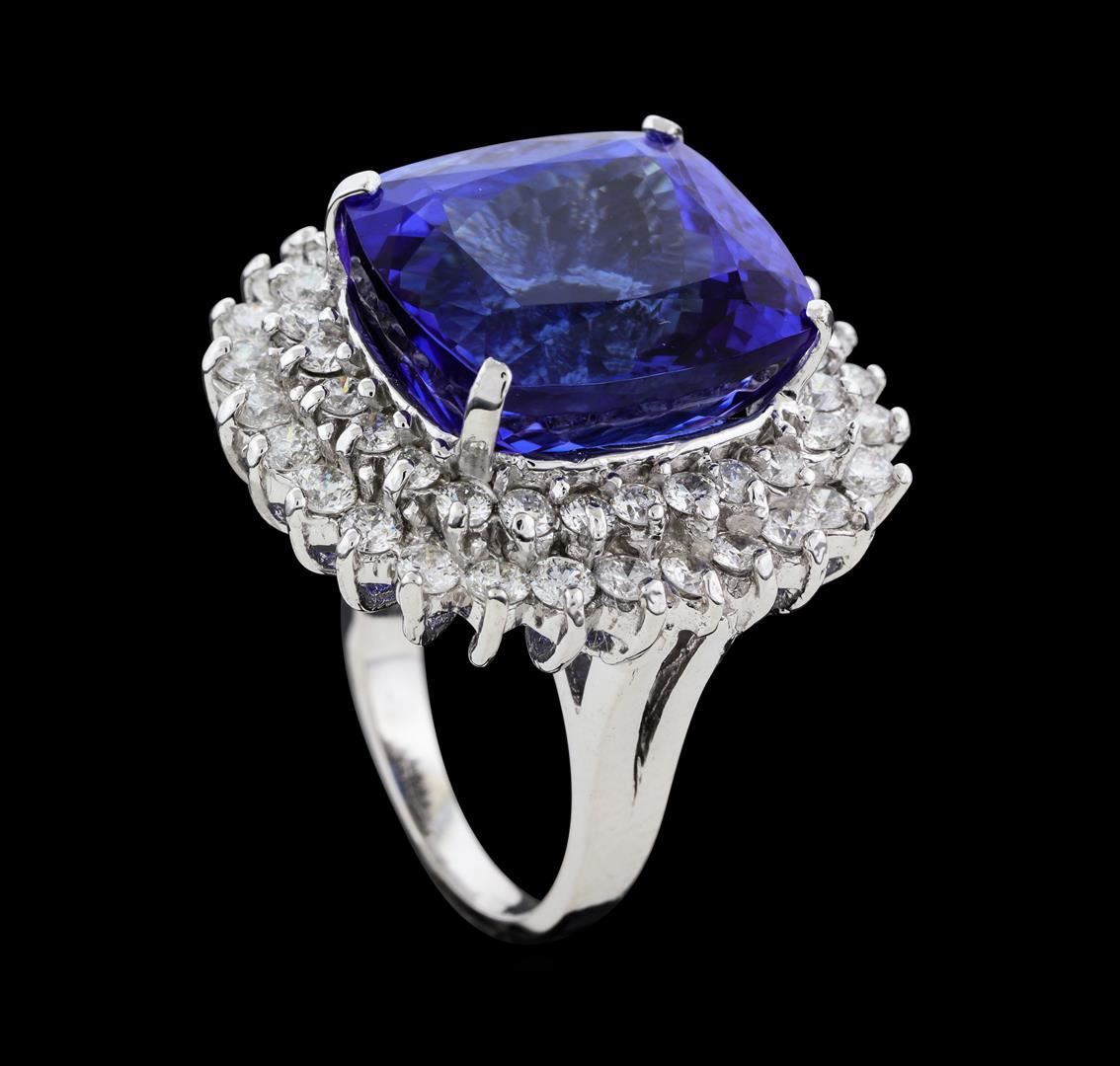 One electronically tested 14KT white gold lady's cast fashion ring with a double basket halo with a bright polish finish. The featured lady's ring has a shank measuring 2.11 millimeters wide. Identified with markings of '14K'. Condition is new, good workmanship. Containing: One prong set rectangular cushion modified brilliant cut natural tanzanite, measuring 15.04 x 13.70 x 9.63mm, (depth est.) 15%. bulge factor, approximate weight of 18.07ct., clarity is eye clean, medium dark, strong, violetish blue color, (GIA vB 6/5), cut is very good. Transmitting light with no distortion, transparent. Colored gemstones are presumed to have been subjected to commonly used enhancement processes. Graded in the setting. Twenty-Eight prong set round brilliant cut diamonds, measuring 2.35 - 2.25 x 1.43mm (depth est.) approximate total weight of 28 Stones = 1.30ct. Graded in the setting. Clarity SI-1 to I-1. Color: G - H Cut Good Twenty-Six prong set round brilliant cut diamonds, measuring 2.10 - 2.00 x 1.27mm (depth est.) approximate total weight of 26 Stones = 0.84ct. Graded in the setting. Clarity SI-1 to I-1. Color: G - H Cut Good. Total Weight of Colored Stones 18.07ct.. Total Weight of Diamonds 2.14ct.. Total Weight of Ring 15.50gm. GAS Appraised at $28,575.00.