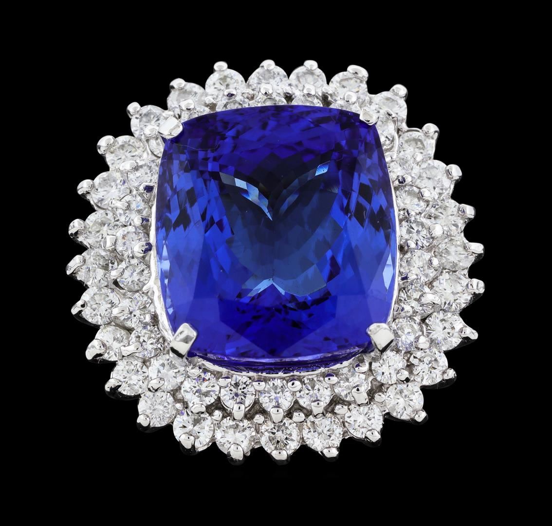 One electronically tested 14KT white gold lady's cast fashion ring with a double basket halo with a bright polish finish. The featured lady's ring has a shank measuring 2.11 millimeters wide. Identified with markings of '14K'. Condition is new, good workmanship. Containing: One prong set rectangular cushion modified brilliant cut natural tanzanite, measuring 15.04 x 13.70 x 9.63mm, (depth est.) 15%. bulge factor, approximate weight of 18.07ct., clarity is eye clean, medium dark, strong, violetish blue color, (GIA vB 6/5), cut is very good. Transmitting light with no distortion, transparent. Colored gemstones are presumed to have been subjected to commonly used enhancement processes. Graded in the setting. Twenty-Eight prong set round brilliant cut diamonds, measuring 2.35 - 2.25 x 1.43mm (depth est.) approximate total weight of 28 Stones = 1.30ct. Graded in the setting. Clarity SI-1 to I-1. Color: G - H Cut Good Twenty-Six prong set round brilliant cut diamonds, measuring 2.10 - 2.00 x 1.27mm (depth est.) approximate total weight of 26 Stones = 0.84ct. Graded in the setting. Clarity SI-1 to I-1. Color: G - H Cut Good. Total Weight of Colored Stones 18.07ct.. Total Weight of Diamonds 2.14ct.. Total Weight of Ring 15.50gm. GAS Appraised at $28,575.00.