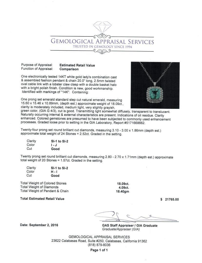 One electronically tested 14KT white gold lady's combination cast & assembled fashion pendant & chain 20.0' long, 2.5mm twisted oval cable link with a lobster claw clasp with a double basket halo with a bright polish finish. Identified with markings of '14K'. Condition is new, good workmanship. Containing: One prong set emerald standard step cut natural emerald, measuring 15.60 x 15.46 x 10.89mm, (depth est.) approximate weight of 18.09ct., clarity is moderately included, medium light, very slightly grayish, green color, (GIA G 4/3), cut is good. Transmitting light somewhat diffusely, transparent to translucent. Naturally occurring internal & external characteristics are present. Indications of oil residue. Clarity enhanced. Colored gemstones are presumed to have been subjected to commonly used enhancement processes. Graded loose prior to setting in the GIA Laboratory, Report #5171668662. Twenty-Four prong set round brilliant cut diamonds, measuring 3.10 - 3.00 x 1.86mm (depth est.) approximate total weight of 24 Stones = 2.52ct. Graded in the setting. Clarity SI-1 to SI-2. Color: I - J Cut Good Twenty prong set round brilliant cut diamonds, measuring 2.80 - 2.70 x 1.71mm (depth est.) approximate total weight of 20 Stones = 1.57ct. Graded in the setting. Clarity SI-1 to SI-2. Color: H - I Cut Good. Total Weight of Colored Stones 18.09ct.. Total Weight of Diamonds 4.09ct.. Total Weight of Pendant & Chain 18.40gm GAS Appraised.