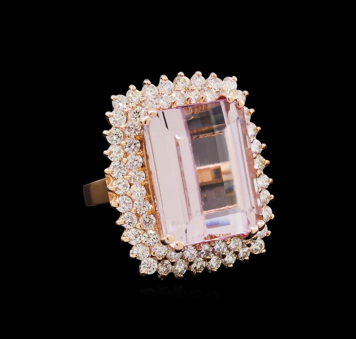 One electronically tested 14KT rose gold lady's cast fashion ring with a basket double halo with a bright polish finish. The featured lady's ring has a shank measuring 2.47 millimeters in width. Identified with markings of "K14". Condition is new, good workmanship. Containing: One prong set emerald modified step cut natural kunzite, measuring 16.51 x 12.91 x 8.70mm, (depth est.) 10%. bulge factor, approximate weight of 18.09ct., clarity is eye clean, very light, moderately strong, purple red color, (GIA PR 2/4), cut is very good. Transmitting light with no distortion, transparent. Colored gemstones are presumed to have been subjected to commonly used enhancement processes. Graded in the setting. Sixty-Four prong set round brilliant cut diamonds, measuring 2.10 - 2.00 x 1.27mm (depth est.) approximate total weight of 64 Stones = 2.06ct. Graded in the setting. Clarity: SI-1 to SI-2. Color: G - Good. Total Weight of Colored Stones 18.09ct. Total Weight of Diamonds 2.06ct. Total Weight of Ring 12.20gm. GAS Appraised at $10,165.00.