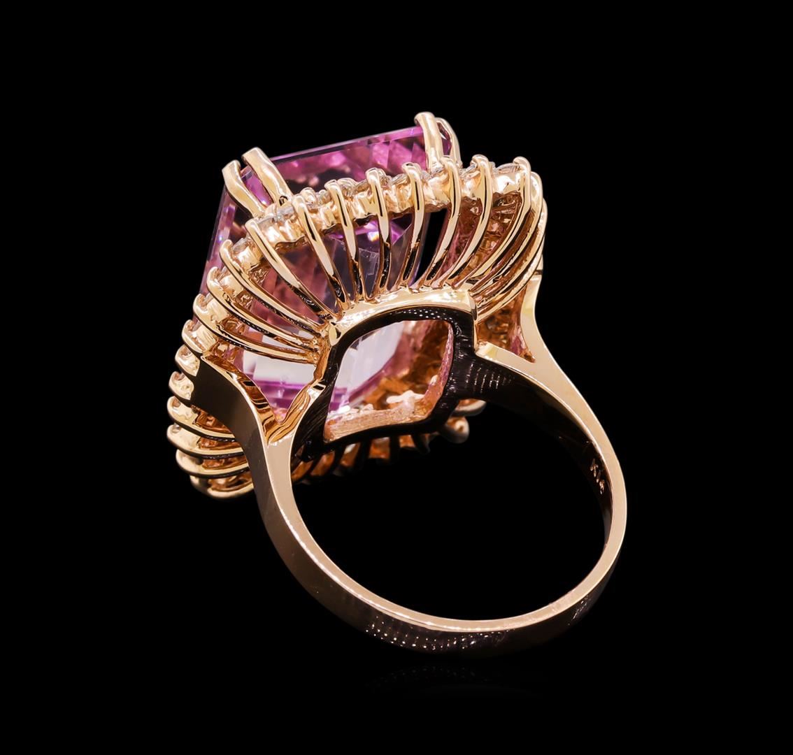 One electronically tested 14KT rose gold lady's cast fashion ring with a basket double halo with a bright polish finish. The featured lady's ring has a shank measuring 2.47 millimeters in width. Identified with markings of "K14". Condition is new, good workmanship. Containing: One prong set emerald modified step cut natural kunzite, measuring 16.51 x 12.91 x 8.70mm, (depth est.) 10%. bulge factor, approximate weight of 18.09ct., clarity is eye clean, very light, moderately strong, purple red color, (GIA PR 2/4), cut is very good. Transmitting light with no distortion, transparent. Colored gemstones are presumed to have been subjected to commonly used enhancement processes. Graded in the setting. Sixty-Four prong set round brilliant cut diamonds, measuring 2.10 - 2.00 x 1.27mm (depth est.) approximate total weight of 64 Stones = 2.06ct. Graded in the setting. Clarity: SI-1 to SI-2. Color: G - Good. Total Weight of Colored Stones 18.09ct. Total Weight of Diamonds 2.06ct. Total Weight of Ring 12.20gm. GAS Appraised at $10,165.00.