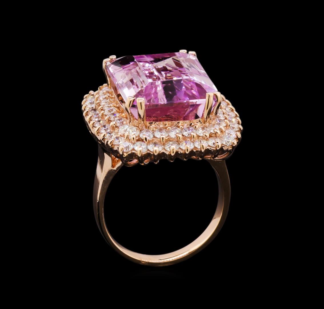 One electronically tested 14KT rose gold lady's cast fashion ring with a basket double halo with a bright polish finish. The featured lady's ring has a shank measuring 2.47 millimeters in width. Identified with markings of "K14". Condition is new, good workmanship. Containing: One prong set emerald modified step cut natural kunzite, measuring 16.51 x 12.91 x 8.70mm, (depth est.) 10%. bulge factor, approximate weight of 18.09ct., clarity is eye clean, very light, moderately strong, purple red color, (GIA PR 2/4), cut is very good. Transmitting light with no distortion, transparent. Colored gemstones are presumed to have been subjected to commonly used enhancement processes. Graded in the setting. Sixty-Four prong set round brilliant cut diamonds, measuring 2.10 - 2.00 x 1.27mm (depth est.) approximate total weight of 64 Stones = 2.06ct. Graded in the setting. Clarity: SI-1 to SI-2. Color: G - Good. Total Weight of Colored Stones 18.09ct. Total Weight of Diamonds 2.06ct. Total Weight of Ring 12.20gm. GAS Appraised at $10,165.00.