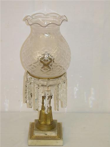 18 1/2" ASTRAL LAMP W/ CUT & FROSTED SHADE, CUT FONT & BRASS STEM ON STEPPED MARBLE BASE - DAMAGE TO SEVERAL PRISMS & WEAR