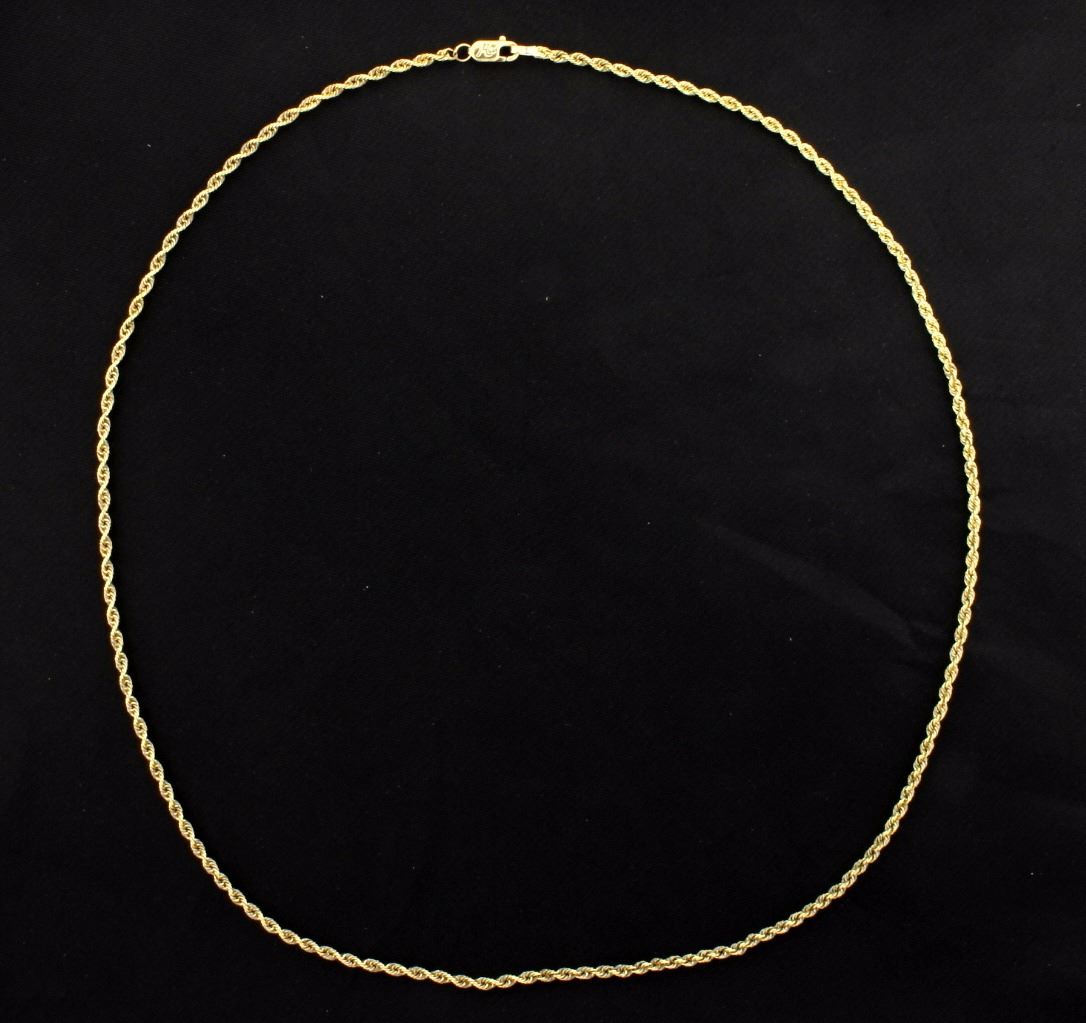 In 14K yellow gold this necklace is 18 1/2 inches long and 2mm thick. 5.0g