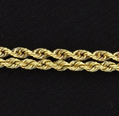 In 14K yellow gold this necklace is 18 1/2 inches long and 2mm thick. 5.0g