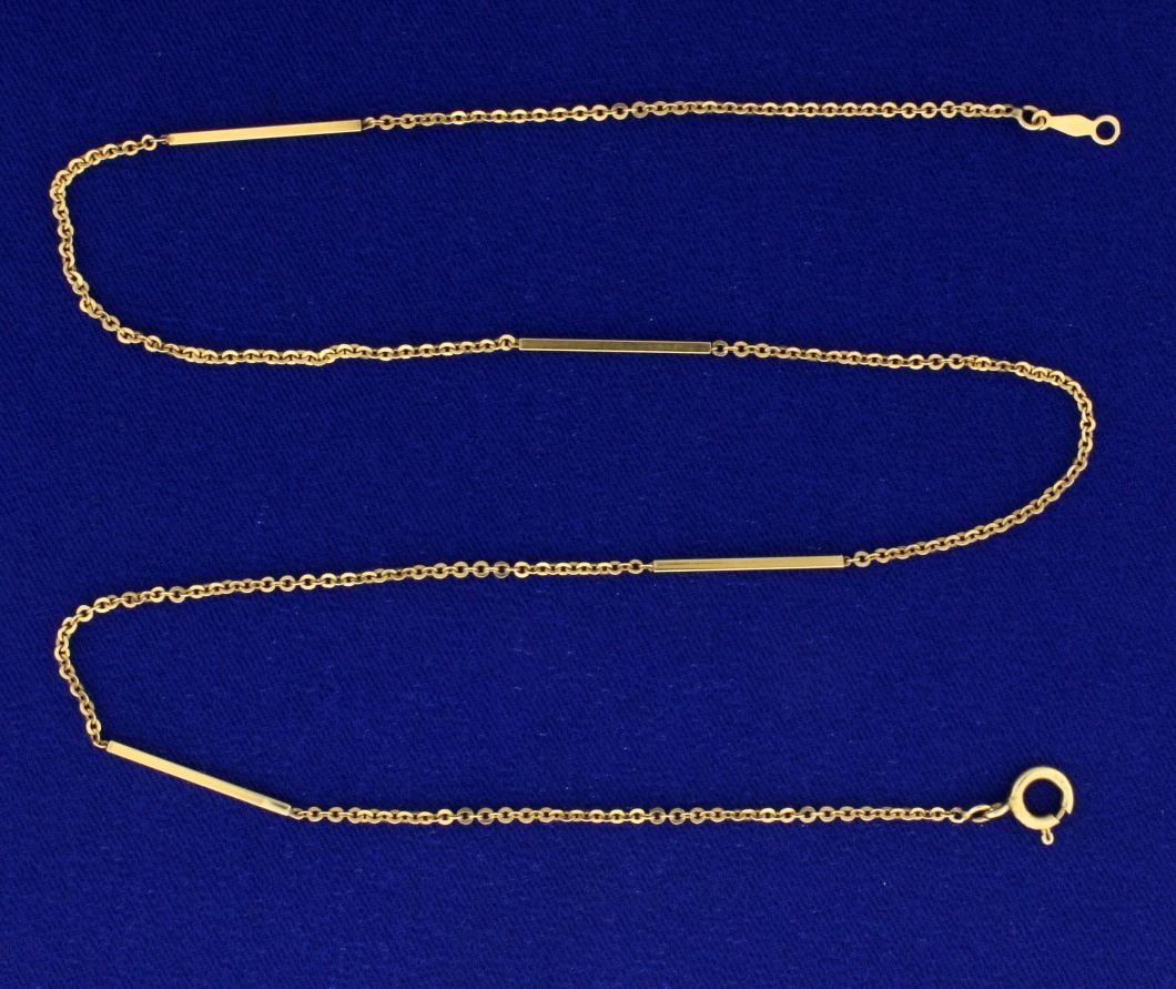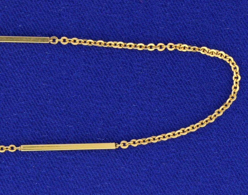 In 14k yellow gold. 1.5mm thick. 4 bars spaced out along chain. 3.2g.