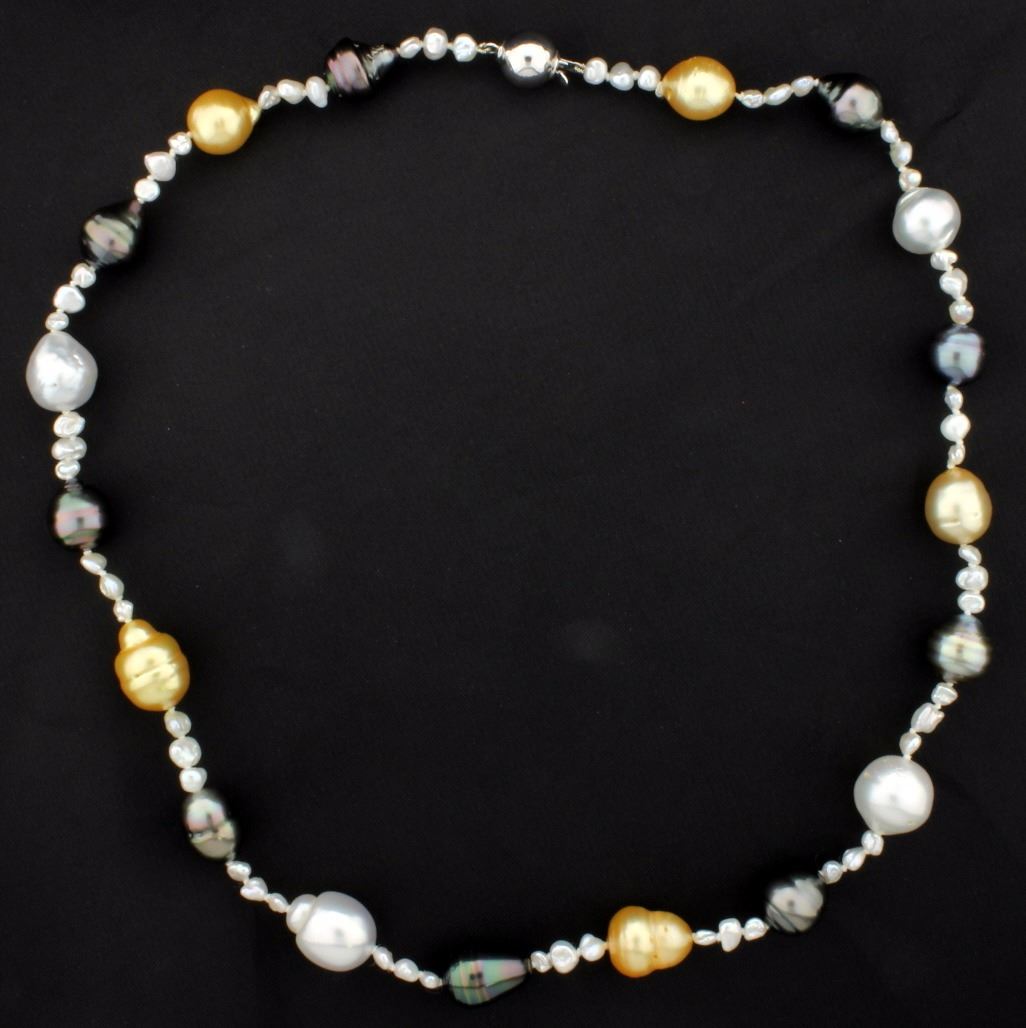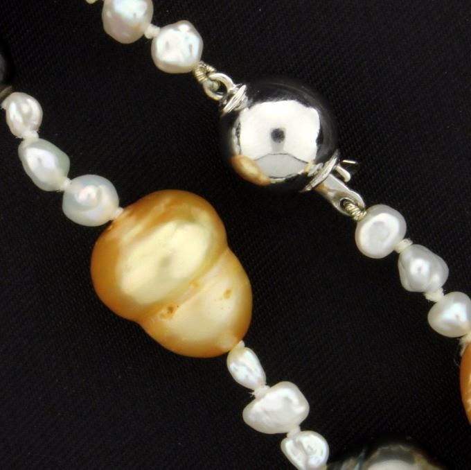 With a 14K white gold clasp, there are silver, gold & white colored pearls.                     33.9g