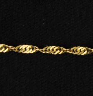 The chain is 14K yellow gold and is 1.4mm thick. 1.3g