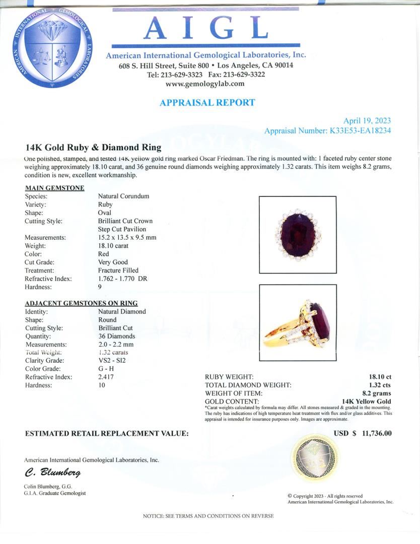 One polished, stamped, and tested 14KT yellow gold ring marked Oscar Friedman. The ring is mounted with: 1 faceted ruby center stone. weighing approximately 18.10 carat, and 36 genuine round diamonds weighing approximately 1.32 carats. This item weighs 8.2 grams, condition is new, excellent workmanship. #MAIN GEMSTONE# Species: Natural Corundum Variety: Ruby Shape: Oval Cutting Style: Brilliant Cut Crown, Step Cut Pavilion Measurements: 15.2 x 13.5 x 9.5mm Weight: 18.10 carat Color: Red Cut Grade: Very Good Treatment: Fracture Filled Refractive Index: 1.762- 1.770 DR Hardness: 9 #ADJACENT GEMSTONES ON RING# Identity: Natural Diamond Shape: Round Cutting Style: Brilliant Cut Quantity: 36 Diamonds Measurements: 2.0 - 2.2mm Total Weight: 1.32 carats Clarity Grade: VS2-SI2 Color Grade: G-H Refractive Index: 2.417 Hardness: 10 RUBY WEIGHT: 18.10 ct TOTAL DIAMOND WEIGHT: 1.32 cts WEIGHT OF ITEM: 8.2 grams GOLD CONTENT: 14K Yellow Gold #LREF-3353