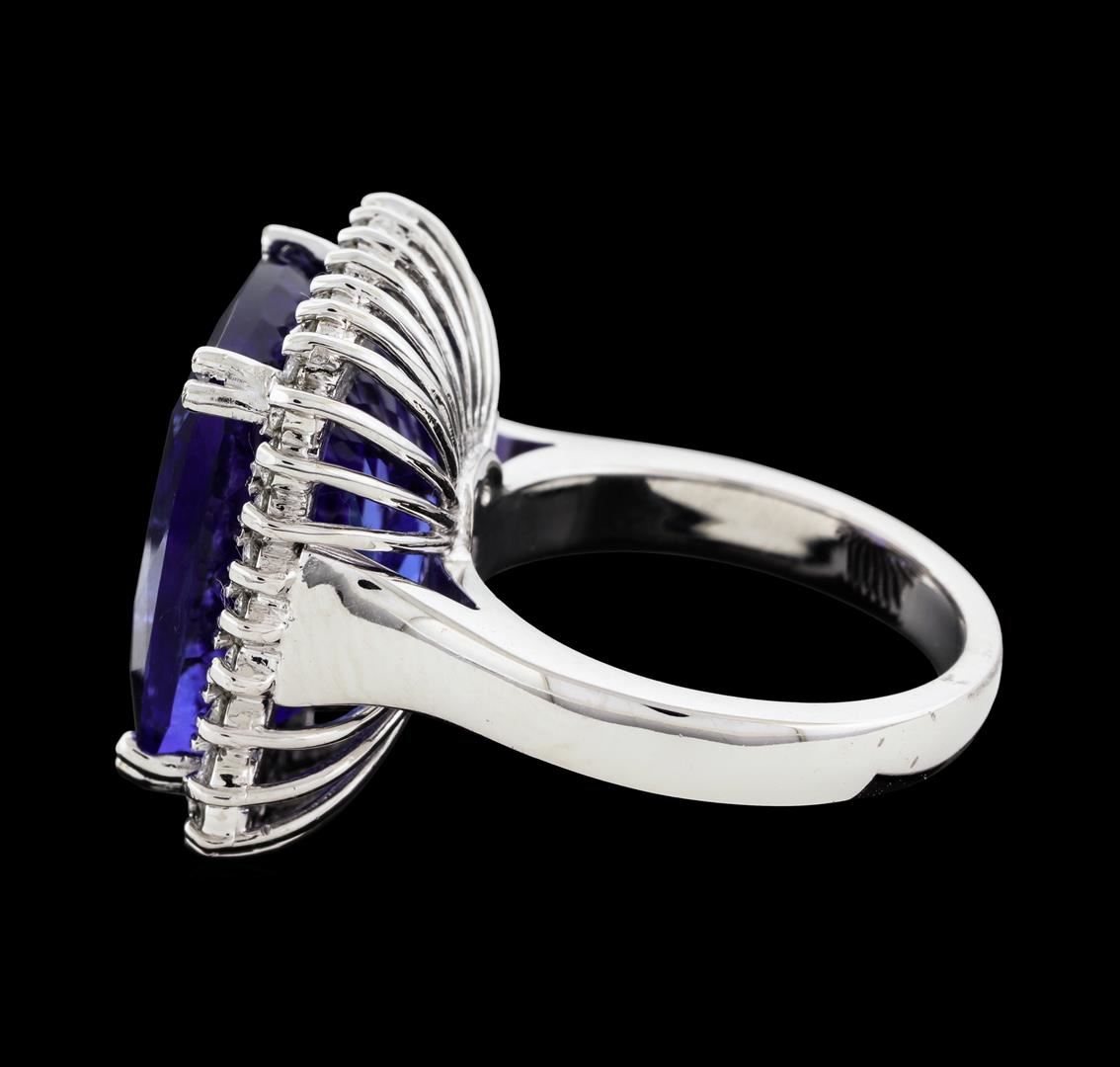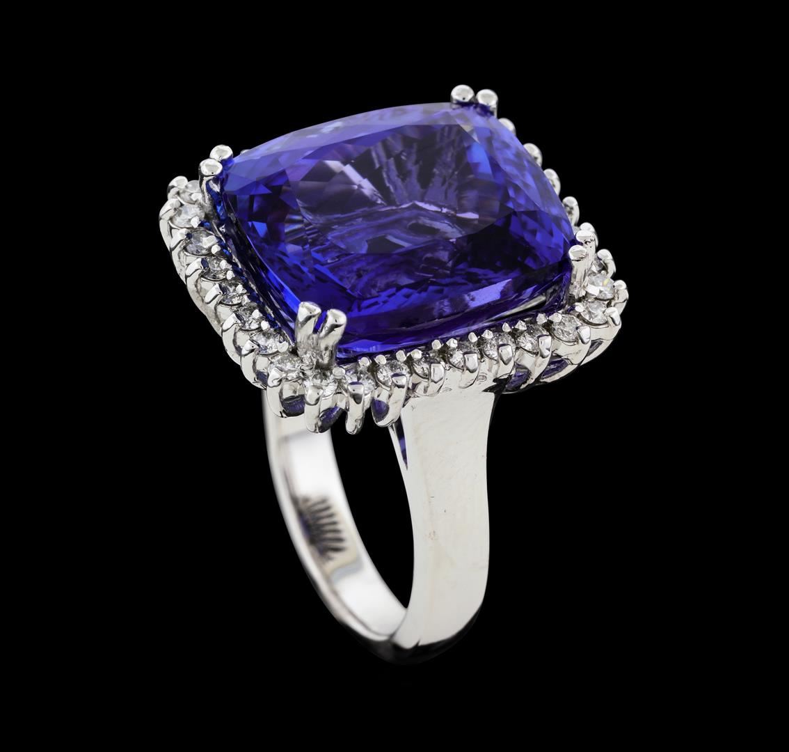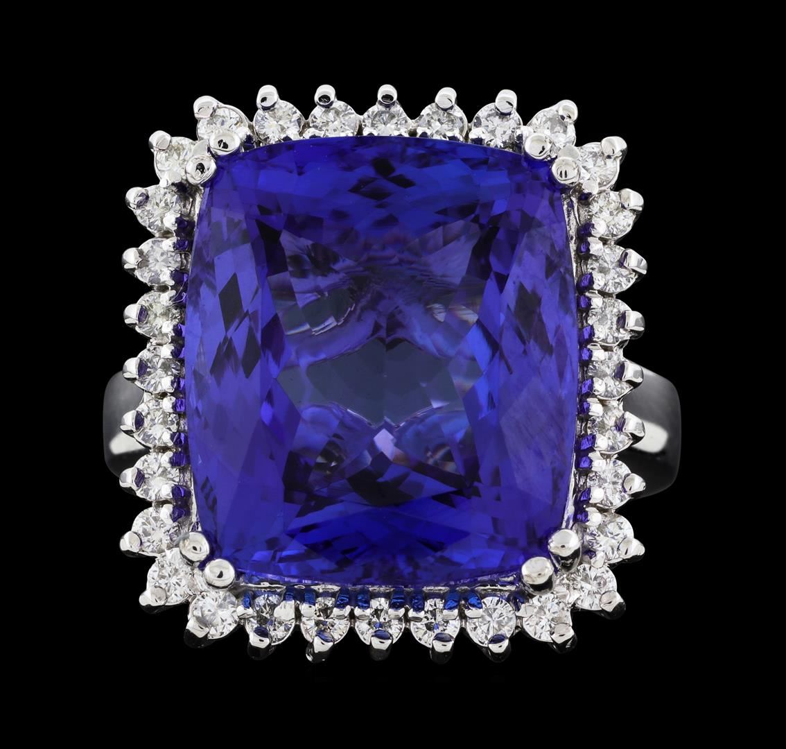 One electronically tested 14KT white gold lady's cast fashion ring with a cathedral shank with a basket halo with a bright polish finish. The featured lady's ring has a shank measuring 3.11 millimeters wide. Identified with markings of 'K14'. Condition is new, good workmanship. Containing: One prong set rectangular cushion modified brilliant cut natural tanzanite, measuring 15.90 x 13.75 x 9.07mm, (depth est.) 16%. bulge factor, approximate weight of 18.13ct., clarity is eye clean, medium dark, moderately strong, violetish blue color, (GIA vB 6/4), cut is very good. Transmitting light with no distortion, transparent. Colored gemstones are presumed to have been subjected to commonly used enhancement processes. Graded in the setting. Thirty-Two prong set round brilliant cut diamonds, measuring 1.70 - 1.60 x 1.02mm (depth est.) approximate total weight of 32 Stones = 0.54ct. Graded in the setting. Clarity SI-1 to I-1. Color: H - I Cut Good. Total Weight of Colored Stones 18.13ct.. Total Weight of Diamonds 0.54ct.. Total Weight of Ring 13.50gm. GAS Appraised at $25,905.00.