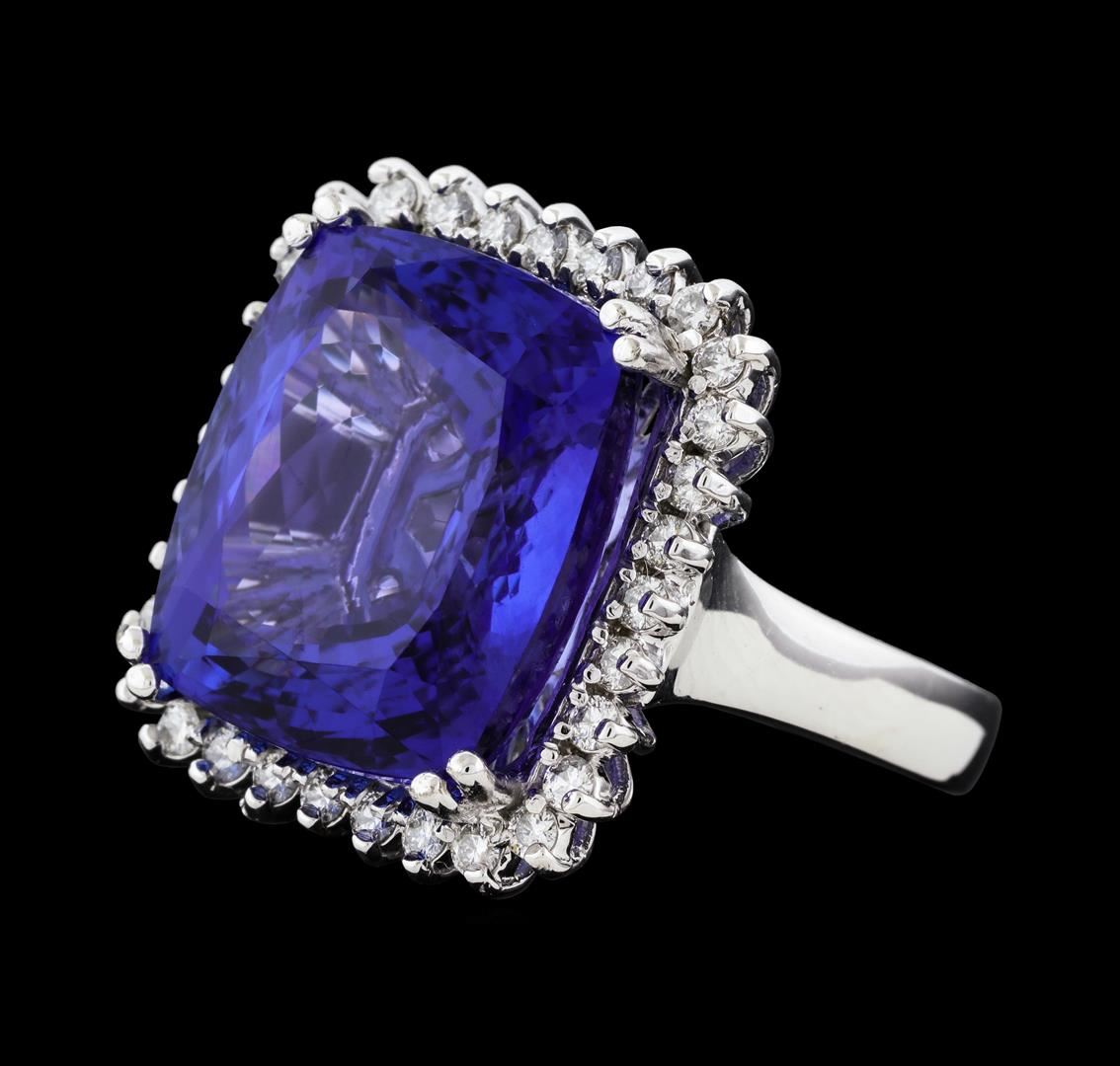 One electronically tested 14KT white gold lady's cast fashion ring with a cathedral shank with a basket halo with a bright polish finish. The featured lady's ring has a shank measuring 3.11 millimeters wide. Identified with markings of 'K14'. Condition is new, good workmanship. Containing: One prong set rectangular cushion modified brilliant cut natural tanzanite, measuring 15.90 x 13.75 x 9.07mm, (depth est.) 16%. bulge factor, approximate weight of 18.13ct., clarity is eye clean, medium dark, moderately strong, violetish blue color, (GIA vB 6/4), cut is very good. Transmitting light with no distortion, transparent. Colored gemstones are presumed to have been subjected to commonly used enhancement processes. Graded in the setting. Thirty-Two prong set round brilliant cut diamonds, measuring 1.70 - 1.60 x 1.02mm (depth est.) approximate total weight of 32 Stones = 0.54ct. Graded in the setting. Clarity SI-1 to I-1. Color: H - I Cut Good. Total Weight of Colored Stones 18.13ct.. Total Weight of Diamonds 0.54ct.. Total Weight of Ring 13.50gm. GAS Appraised at $25,905.00.