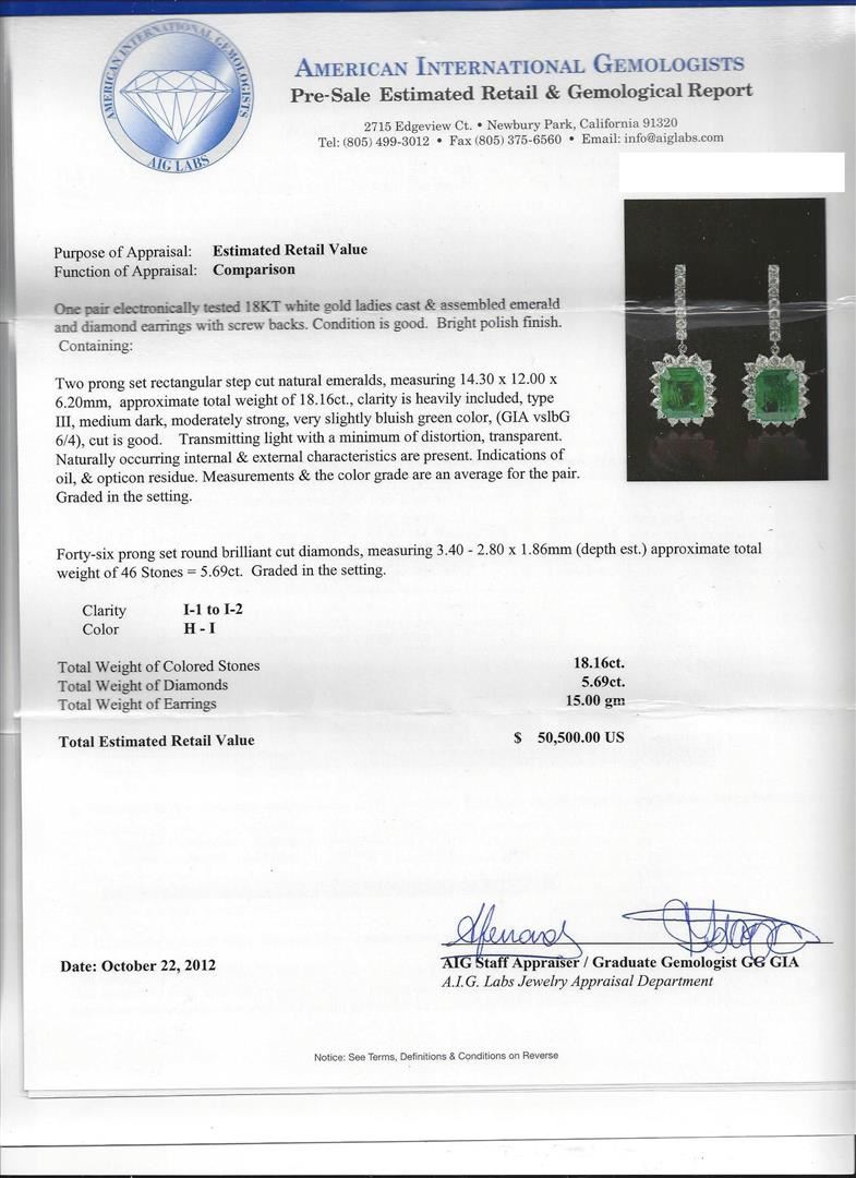 One pair electronically tested 18KT white gold ladies cast & assembled emerald and diamond earrings with screw backs. Condition is good. Bright polish finish. Containing: Two prong set rectangular step cut natural emeralds, measuring 14.30 x 12.00 x 6.20mm, approximate total weight of 18.16ct., clarity is heavily included, type III, medium dark, moderately strong, very slightly bluish green color, (GIA vslbG 6/4), cut is good. Transmitting light with a minimum of distortion, transparent. Naturally occurring internal & external characteristics are present. Indications of oil, & opticon residue. Measurements & the color grade are an average for the pair. Graded in the setting. Forty-six prong set round brilliant cut diamonds, measuring 3.40 - 2.80 x 1.86mm (depth est.) approximate total weight of 46 Stones = 5.69ct. Graded in the setting. Clarity: I-1 to I-2. Color: H - I. Total Weight of Colored Stones: 18.16ct. Total Weight of Diamonds: 5.69ct. Total Weight of Diamonds: 5.69ct. Total Weight of Earrings: 15.00 grams. AIG Appraised at $50,500.00.