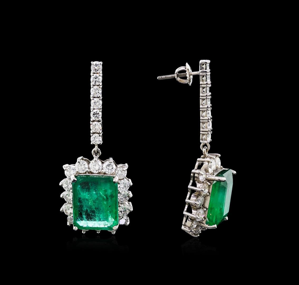 One pair electronically tested 18KT white gold ladies cast & assembled emerald and diamond earrings with screw backs. Condition is good. Bright polish finish. Containing: Two prong set rectangular step cut natural emeralds, measuring 14.30 x 12.00 x 6.20mm, approximate total weight of 18.16ct., clarity is heavily included, type III, medium dark, moderately strong, very slightly bluish green color, (GIA vslbG 6/4), cut is good. Transmitting light with a minimum of distortion, transparent. Naturally occurring internal & external characteristics are present. Indications of oil, & opticon residue. Measurements & the color grade are an average for the pair. Graded in the setting. Forty-six prong set round brilliant cut diamonds, measuring 3.40 - 2.80 x 1.86mm (depth est.) approximate total weight of 46 Stones = 5.69ct. Graded in the setting. Clarity: I-1 to I-2. Color: H - I. Total Weight of Colored Stones: 18.16ct. Total Weight of Diamonds: 5.69ct. Total Weight of Diamonds: 5.69ct. Total Weight of Earrings: 15.00 grams. AIG Appraised at $50,500.00.