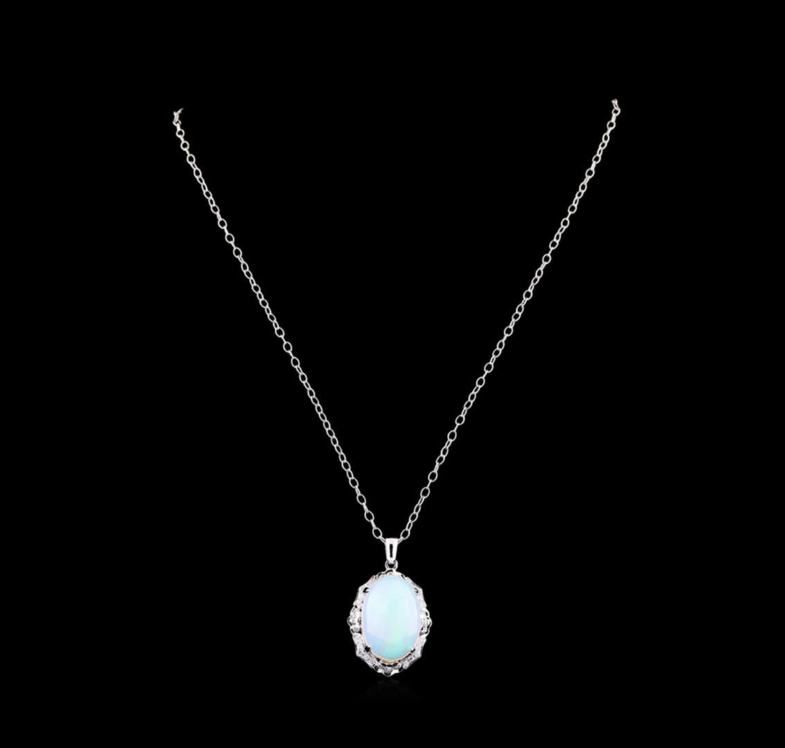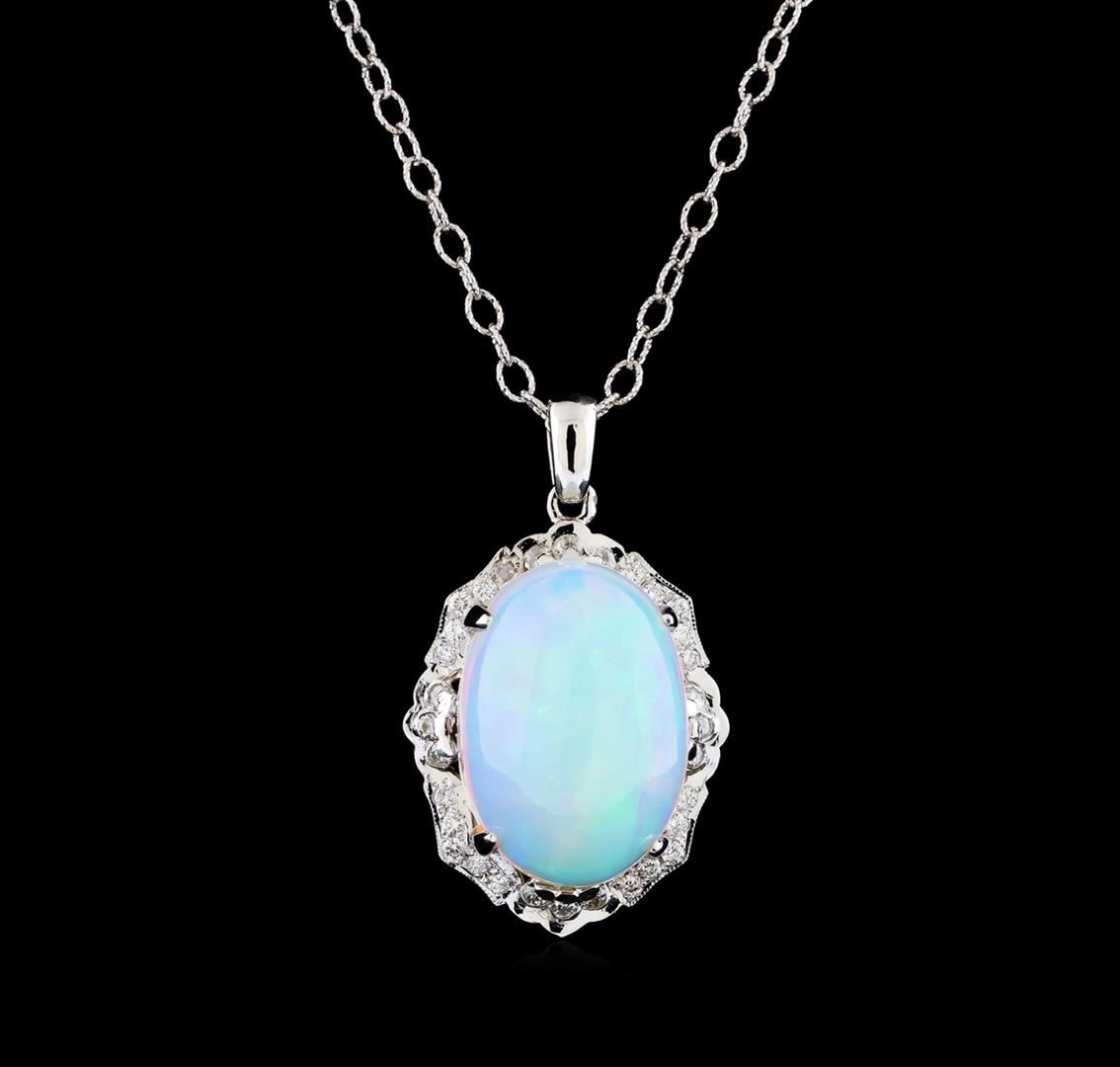 One electronically tested 14KT white gold lady's combination cast & assembled fashion pendant & chain 18.0" long, 2.6mm oval twisted cable link with a lobster claw clasp with a bright polish with milgrain detailing finish. The featured lady's pendant has a drop measurement of 38 millimeters in length. Identified with markings of "14K". Condition is new, good workmanship. Containing: Twenty bead set round brilliant cut diamonds, measuring 1.70 - 1.60 x 1.03mm (depth est.) approximate total weight of 20 Stones = 0.38ct. Graded in the setting. Clarity: VS-2 to SI-1. Color: G - Very Good One crystal opal that is cut in a oval shaped cabochon and is prong set, measuring 22.91 mm long x 15.91 mm wide, and 11.18 mm thick and the approximate weight is 18.19 carats. The opal has a bright, blue-green play of color (fire) in a rolling flashfire pattern; a medium dome; a good cut; no inclusions; consistent in its brightness and pattern; and is not directional. Graded in the setting. Twelve bezel set round brilliant cut diamonds, measuring 1.90 - 1.80 x 1.15mm (depth est.) approximate total weight of 12 Stones = 0.30ct. Graded in the setting. Clarity: SI-1 to SI-2. Color: H - I. Cut Good. Total Weight of Diamonds 0.68ct. Total Weight of Opals 18.19ct. Total Weight of Pendant & Chain 14.10gm. GAS Appraised at $8,715.00.