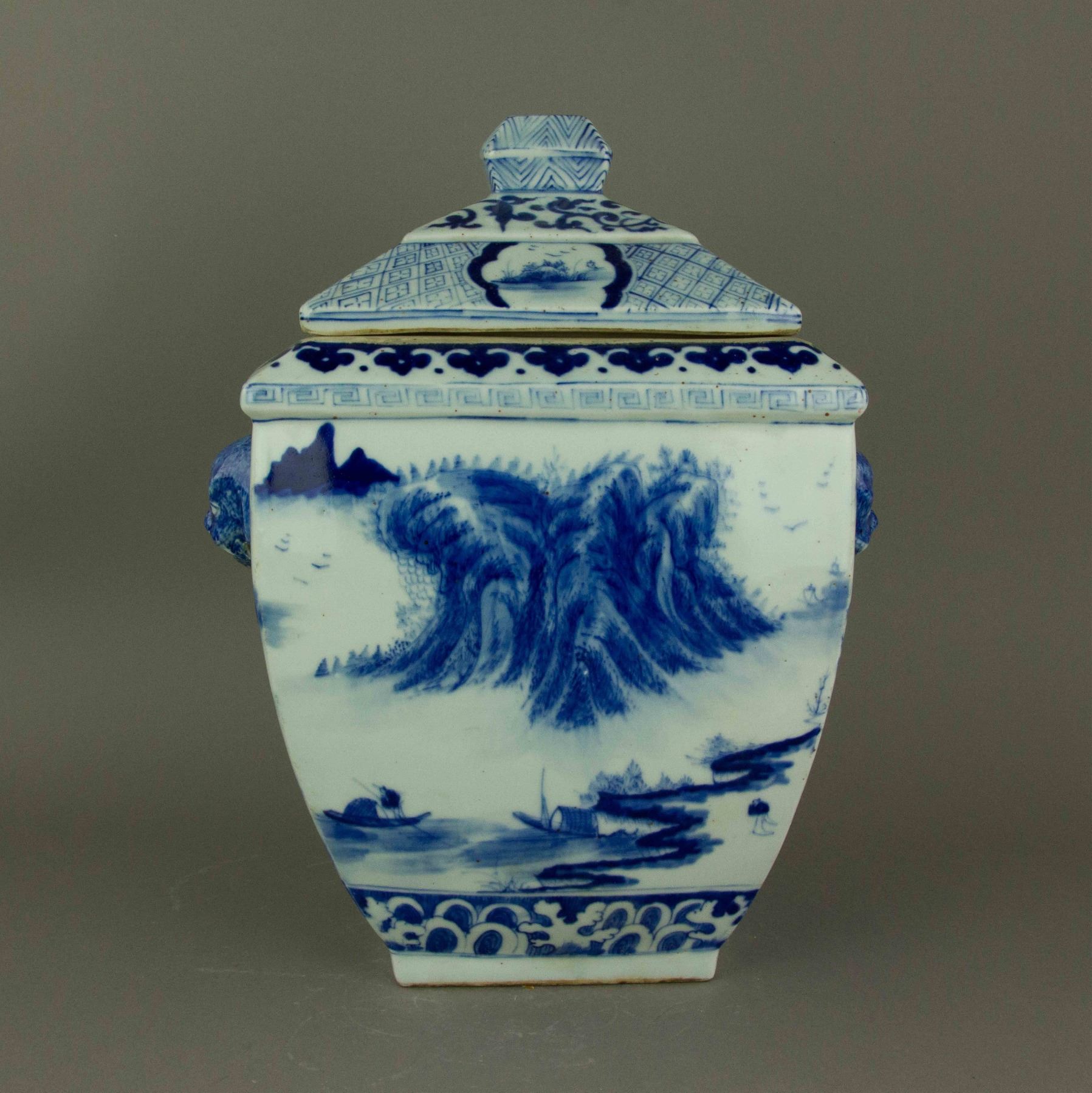 Chinese blue and white porcelain jar with cover; 18th to 19th century; of square baluster body flanked by double beast-shaped handles; painted with figures and landscape; H: 30.5 cm, W: 19.5 cm, L: 24 cm, 4242 grams