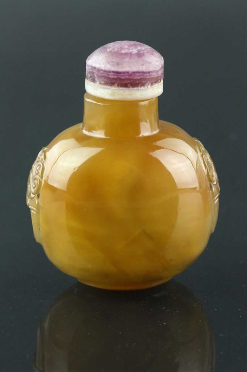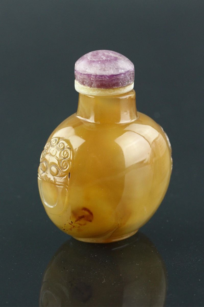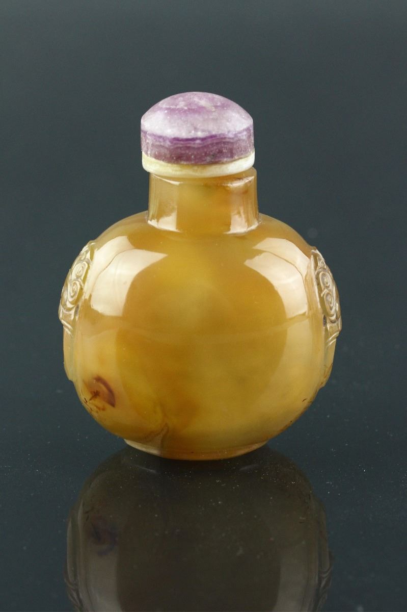 Chinese agate snuff bottle; 18th or 19th century; of globular form with double mythical beast faux ring handle on sides; H: 8 cm, W: 6 cm, 148 grams
