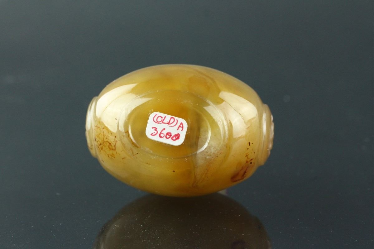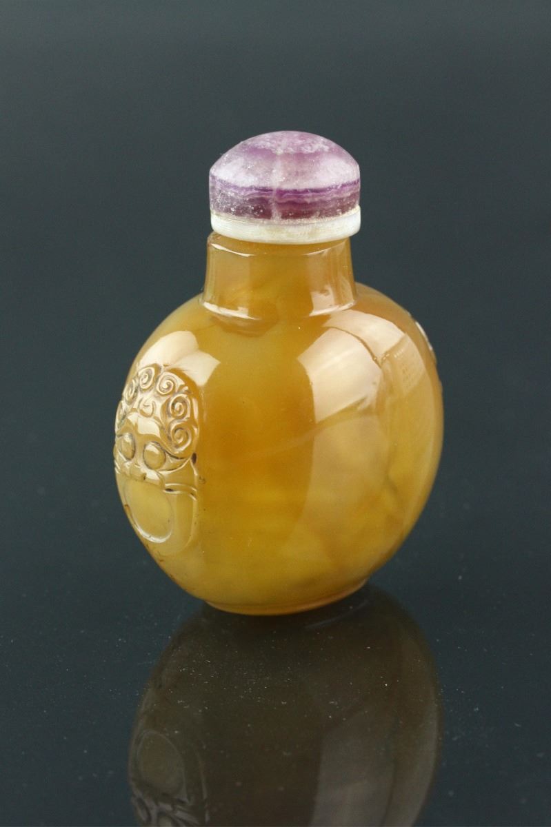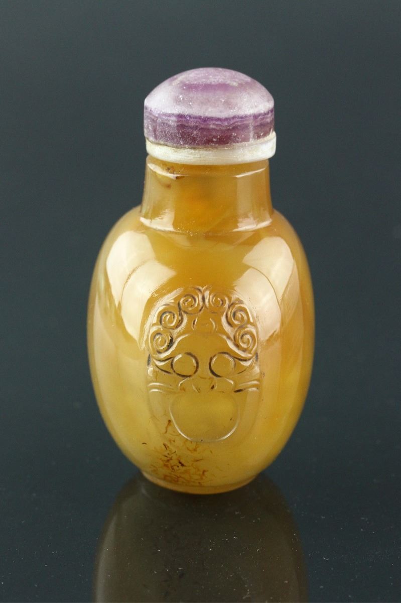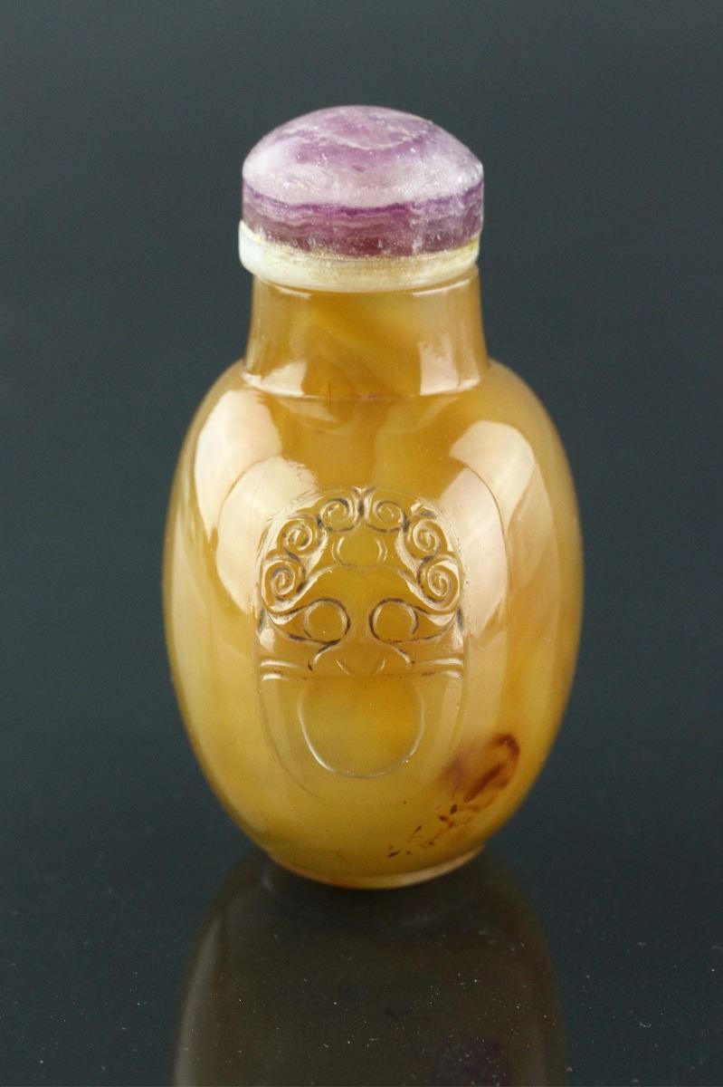 Chinese agate snuff bottle; 18th or 19th century; of globular form with double mythical beast faux ring handle on sides; H: 8 cm, W: 6 cm, 148 grams