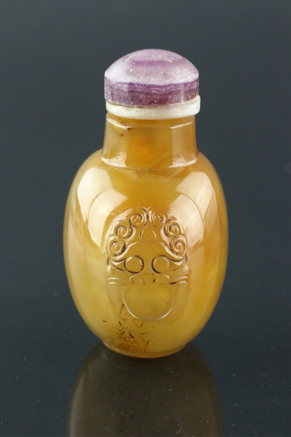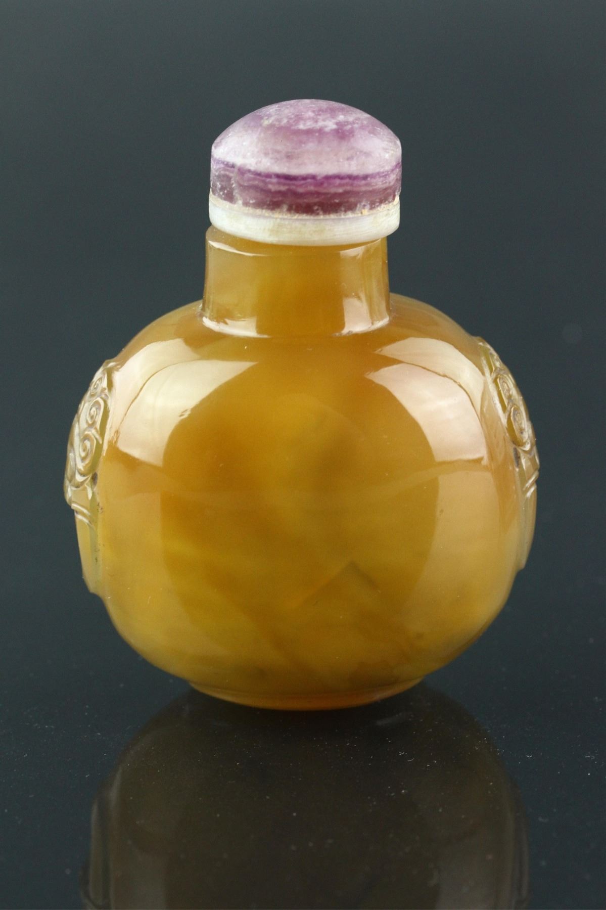Chinese agate snuff bottle; 18th or 19th century; of globular form with double mythical beast faux ring handle on sides; H: 8 cm, W: 6 cm, 148 grams