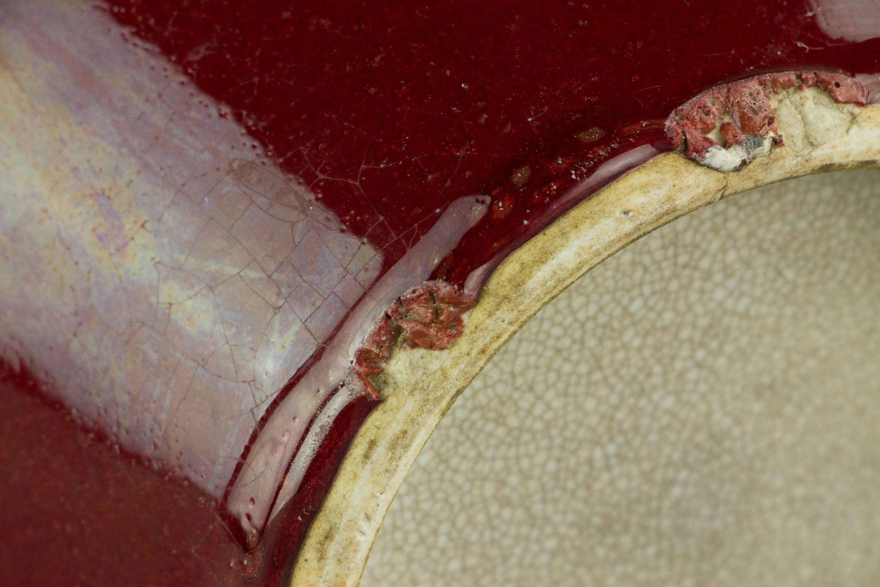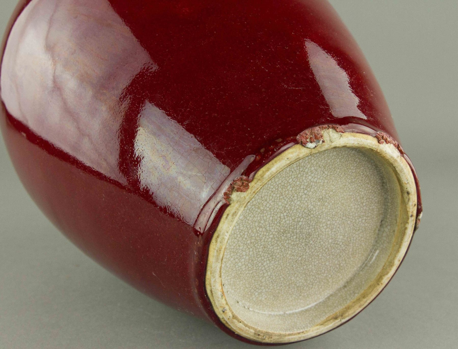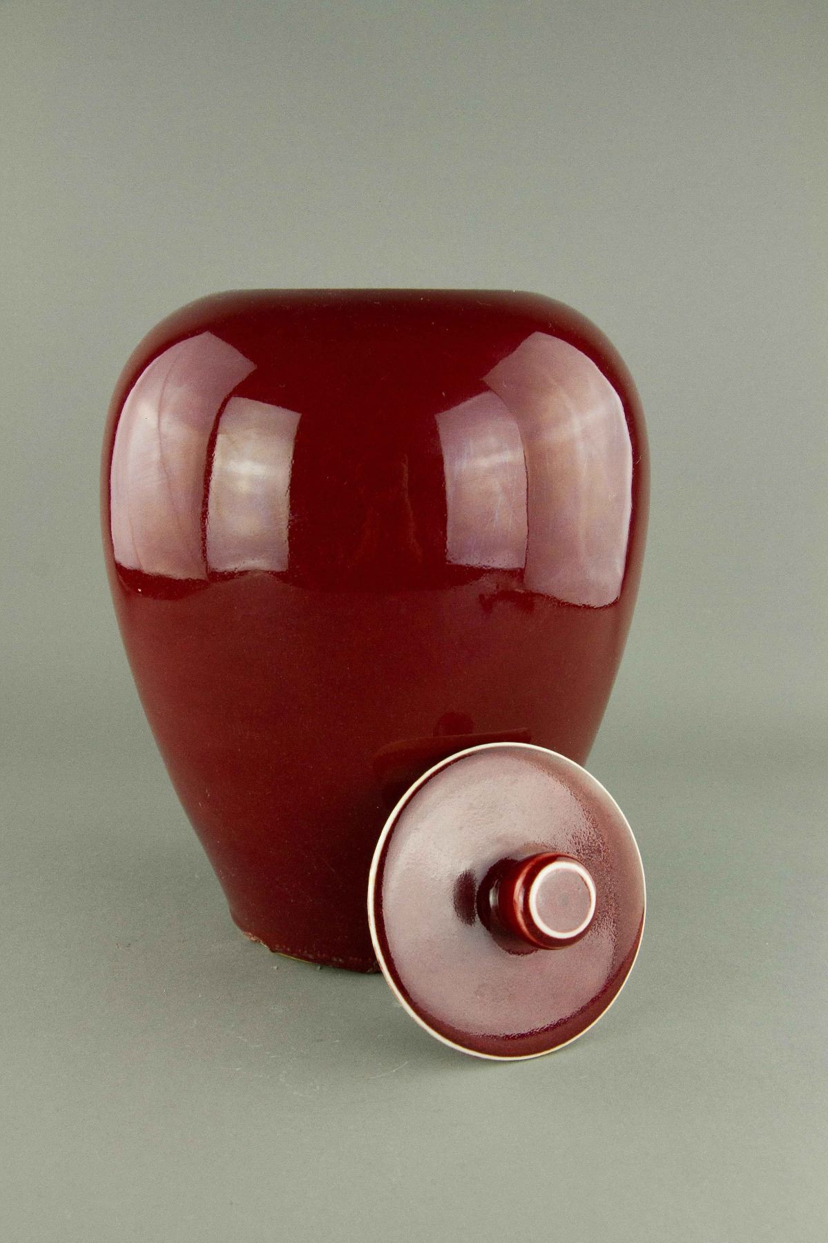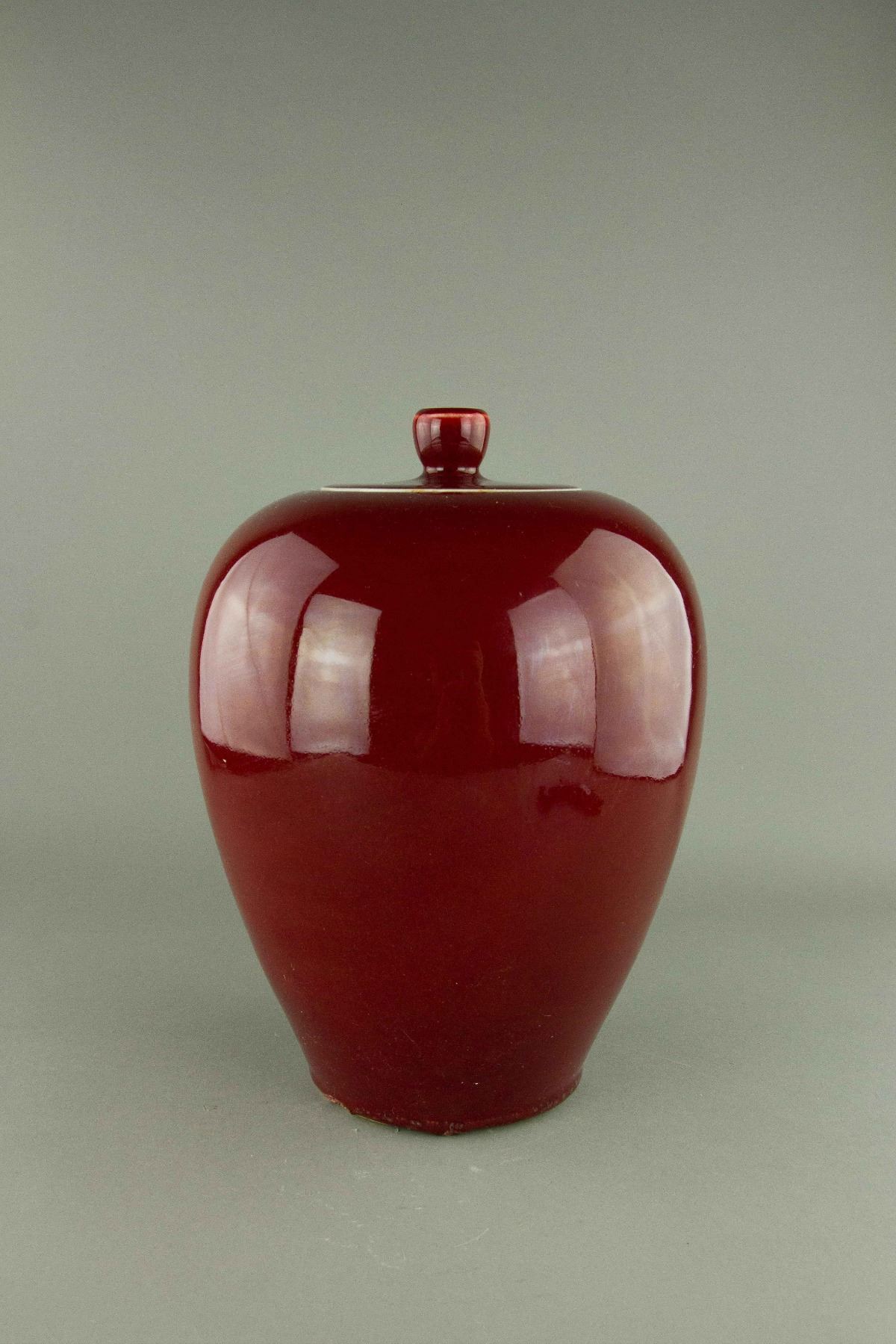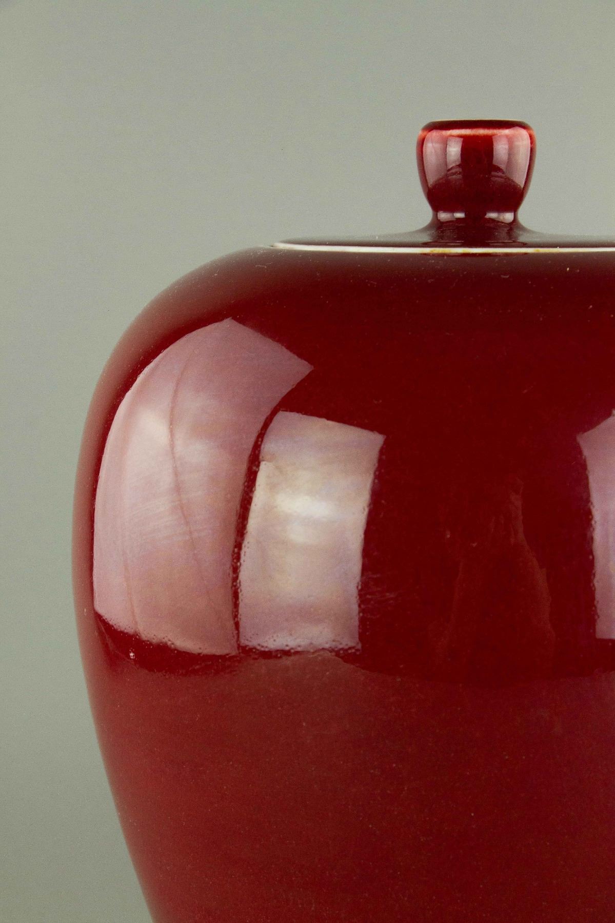 Chinese copper red porcelain ginger jar; 18th to 19th century; of globular body tapering to the base; with a flatten handled cover; applied with a thick layer of deep red glaze; unglazed base; H: 28 cm, D: 22 cm, 2837 grams. PROVENANCE: Private collection, Circa 1980 (Nagoya, Japan)