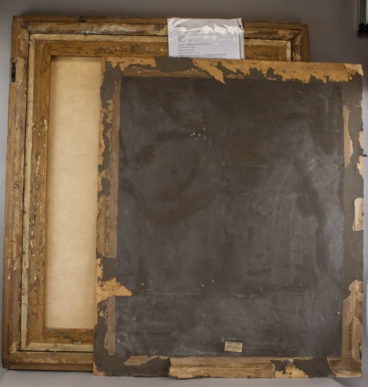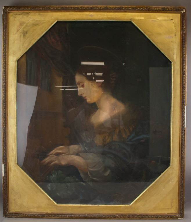 18/19th Century Charcoal on canvas, framed. Featuring portrait of a female figure. Frame damaged. Backing panel has come loose. "BEAVER BOARD PURE WOOD FIBRE" / Surface sealsed and sized by SEALTITE Process Patented 1916" stamped on backing board. Label on backing panel reads "ERNEST ALDEN / PICTURE RESTORER / FRAMER and DEALER / 39 KING'S ROAD, CHELSEA, SW.3 PHONE: SLOANE 1419 Established 1893 Order No. 39084". Accompanied with online appraisal issued by DrLoriV.com. 94 x 77 cm (37 x 30.5 in), Frame: 110 x 93 cm, 39.5 x 36.5 in).