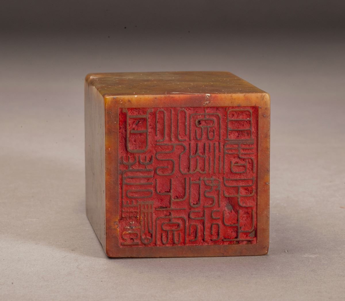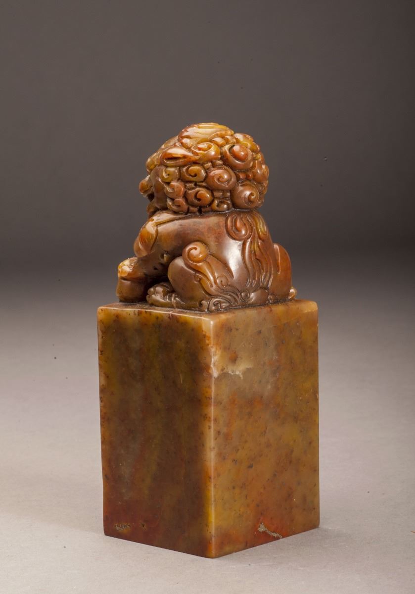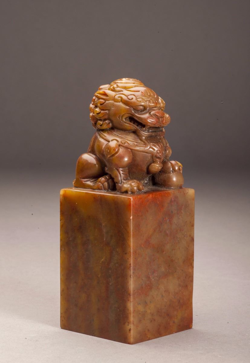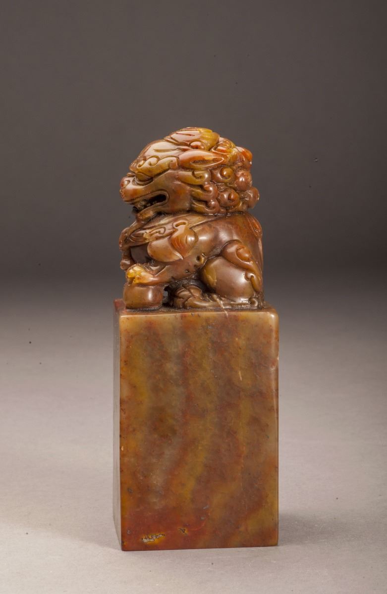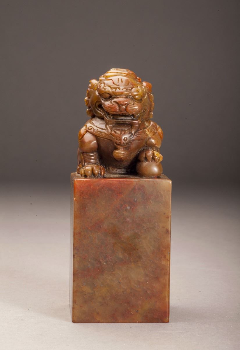 Within The Alternative Brown Tone Throughout, This Fine Seal Made Of Shoushan Stone. A Vividly Carved Lion Statue Siting On The Top Of The Square Seal, Designed In Extremely Detailed And With Its Face Vividly Expressed. With A Bell Hanging On Neck, And The Left Front Foot Steo On A Ball.