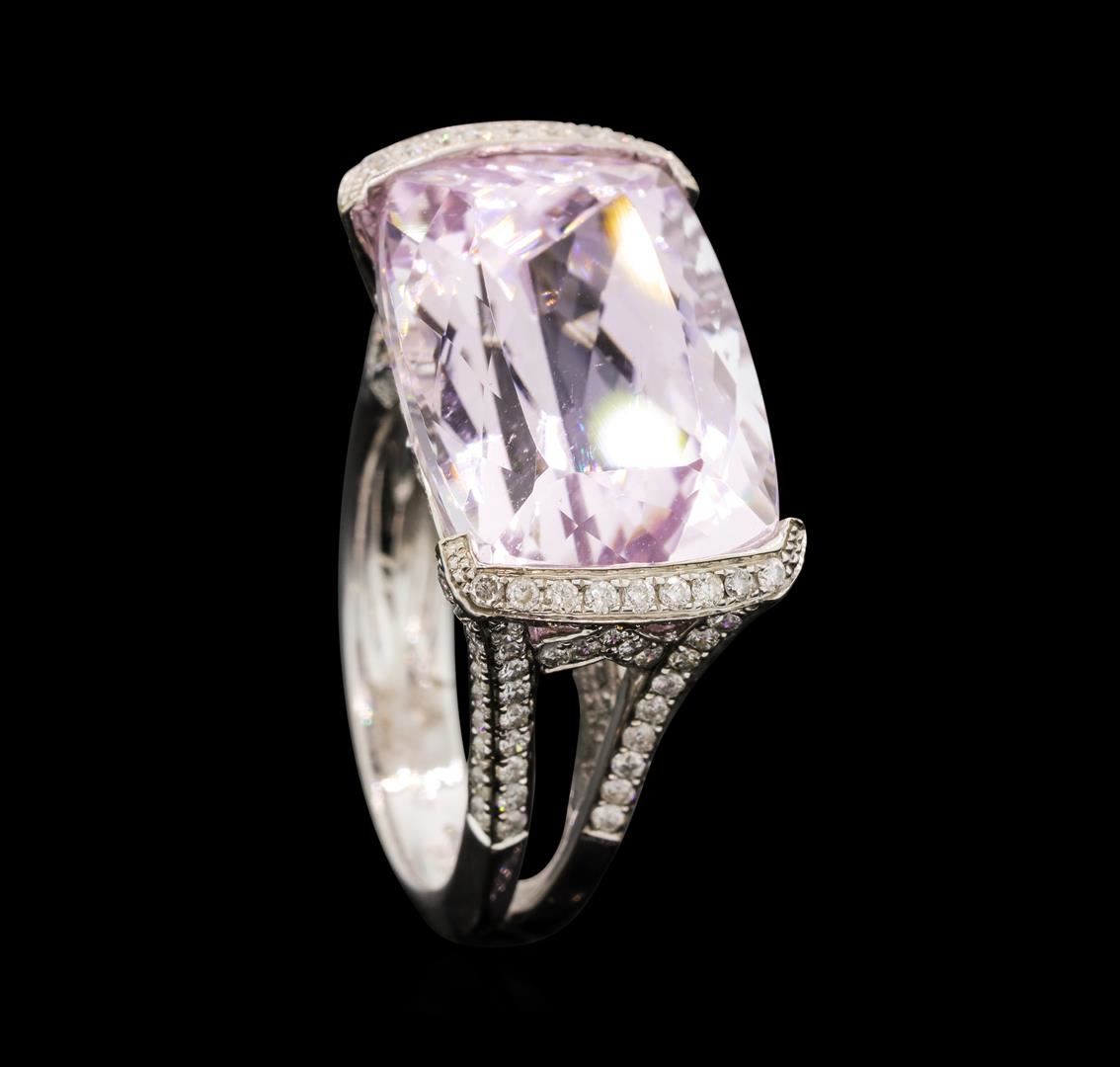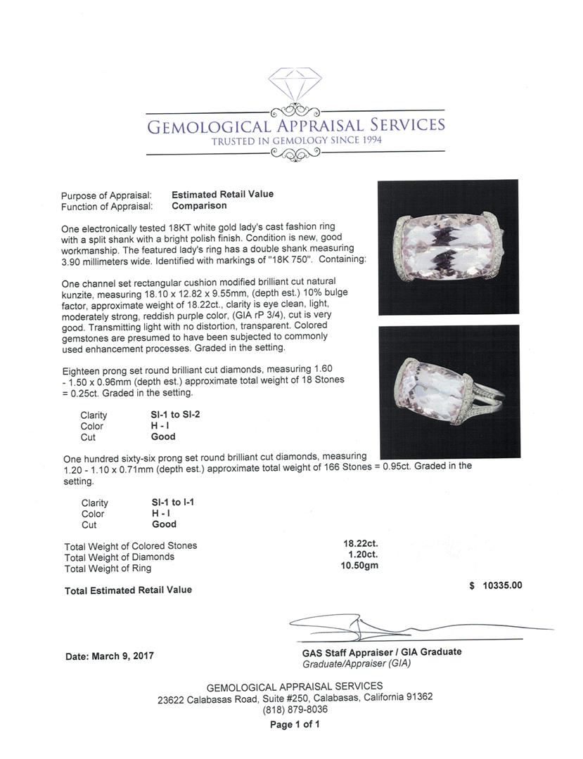 One electronically tested 18KT white gold lady's cast fashion ring with a split shank with a bright polish finish. The featured lady's ring has a double shank measuring 3.90 millimeters wide. Identified with markings of '18K 750'. Condition is new, good workmanship. Containing: One channel set rectangular cushion modified brilliant cut natural kunzite, measuring 18.10 x 12.82 x 9.55mm, (depth est.) 10%. bulge factor, approximate weight of 18.22ct., clarity is eye clean, light, moderately strong, reddish purple color, (GIA rP 3/4), cut is very good. Transmitting light with no distortion, transparent. Colored gemstones are presumed to have been subjected to commonly used enhancement processes. Graded in the setting. Eighteen prong set round brilliant cut diamonds, measuring 1.60 - 1.50 x 0.96mm (depth est.) approximate total weight of 18 Stones = 0.25ct. Graded in the setting. Color H - I Clarity SI-1 to SI-2 Cut Good One Hundred Sixty-Six prong set round brilliant cut diamonds, measuring 1.20 - 1.10 x 0.71mm (depth est.) approximate total weight of 166 Stones = 0.95ct. Graded in the setting. Color H - I Clarity SI-1 to I-1 Cut Good. Total Weight of Colored Stones 18.22ct.. Total Weight of Diamonds 1.20ct.. Total Weight of Ring 10.50gm GAS Appraised at $10,335.00.