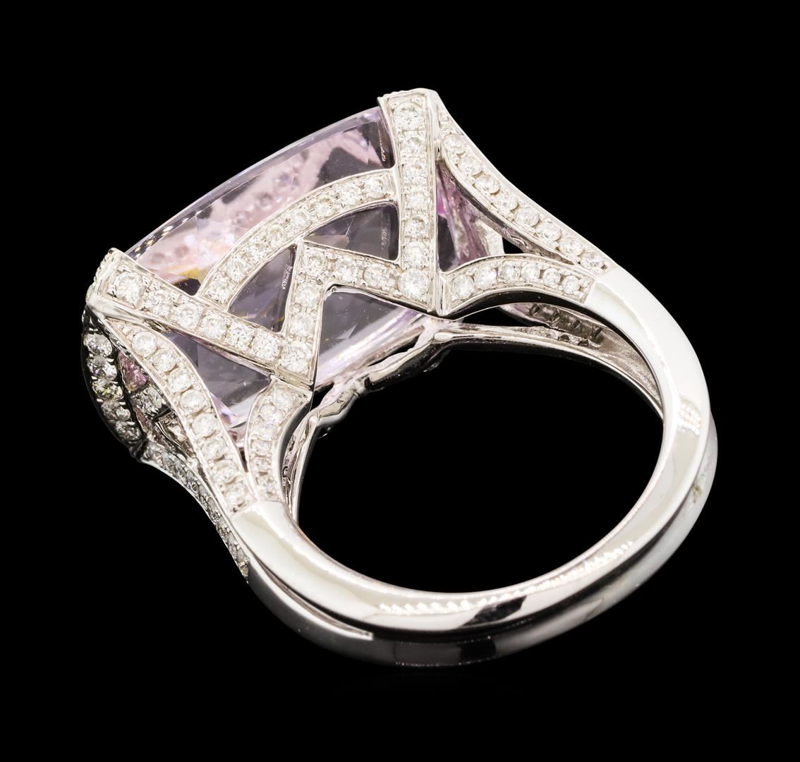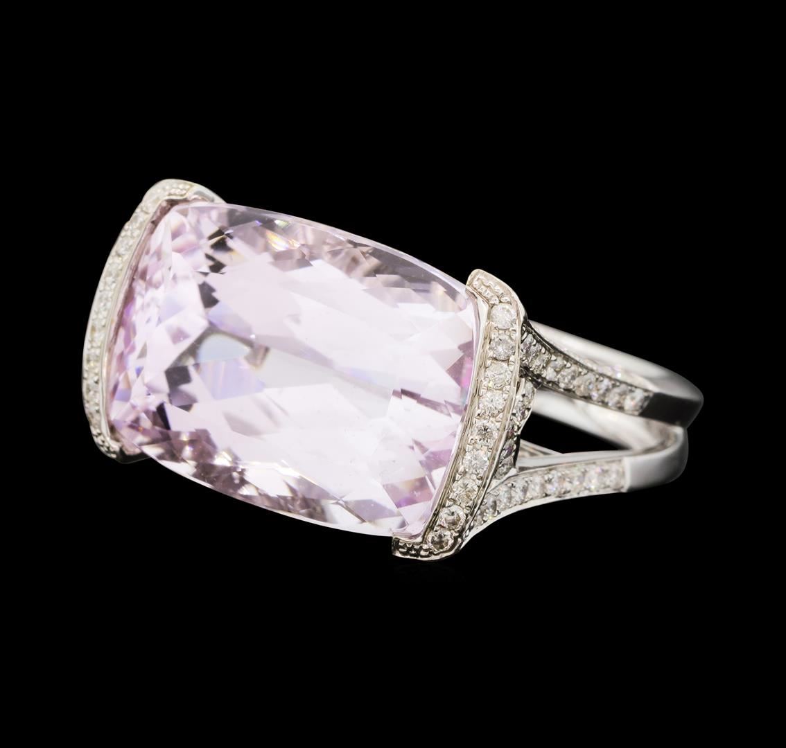 One electronically tested 18KT white gold lady's cast fashion ring with a split shank with a bright polish finish. The featured lady's ring has a double shank measuring 3.90 millimeters wide. Identified with markings of '18K 750'. Condition is new, good workmanship. Containing: One channel set rectangular cushion modified brilliant cut natural kunzite, measuring 18.10 x 12.82 x 9.55mm, (depth est.) 10%. bulge factor, approximate weight of 18.22ct., clarity is eye clean, light, moderately strong, reddish purple color, (GIA rP 3/4), cut is very good. Transmitting light with no distortion, transparent. Colored gemstones are presumed to have been subjected to commonly used enhancement processes. Graded in the setting. Eighteen prong set round brilliant cut diamonds, measuring 1.60 - 1.50 x 0.96mm (depth est.) approximate total weight of 18 Stones = 0.25ct. Graded in the setting. Color H - I Clarity SI-1 to SI-2 Cut Good One Hundred Sixty-Six prong set round brilliant cut diamonds, measuring 1.20 - 1.10 x 0.71mm (depth est.) approximate total weight of 166 Stones = 0.95ct. Graded in the setting. Color H - I Clarity SI-1 to I-1 Cut Good. Total Weight of Colored Stones 18.22ct.. Total Weight of Diamonds 1.20ct.. Total Weight of Ring 10.50gm GAS Appraised at $10,335.00.