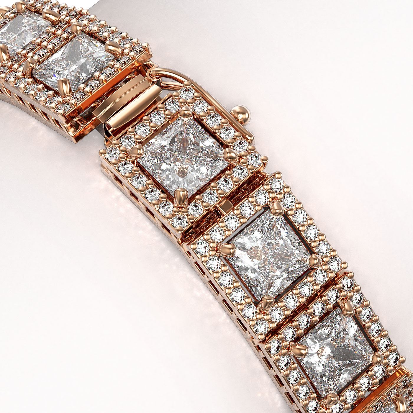 REF-3369Y8K -42726 ---- 18.24 CTW Princess Diamond Designer Bracelet 18K Rose Gold ---- Luxury Designer Brand Bracelet Appraised at $148,250 Certificate Number US42726 18K Rose gold, Bracelet Size is 7 Inches, Bracelet measuring approx. 8 mm x 7 Inches, weighing in total approx. 24 grams. Made in the USA and is stamped 18K, Main stone 14.4 carat total weight containing 24 pieces of I-J color with VS/SI quality Princess shape cut Diamond , Stone #2 3.84 carat total weight containing 480 pieces of G-H color with VS/SI quality Round shape cut Diamond