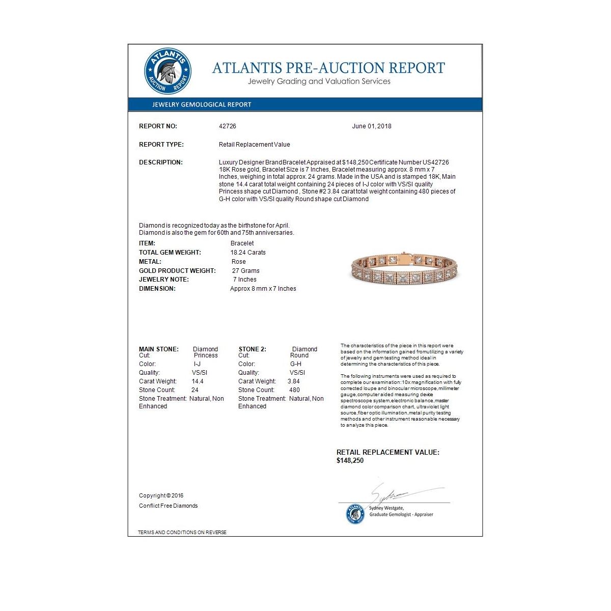 REF-3369Y8K -42726 ---- 18.24 CTW Princess Diamond Designer Bracelet 18K Rose Gold ---- Luxury Designer Brand Bracelet Appraised at $148,250 Certificate Number US42726 18K Rose gold, Bracelet Size is 7 Inches, Bracelet measuring approx. 8 mm x 7 Inches, weighing in total approx. 24 grams. Made in the USA and is stamped 18K, Main stone 14.4 carat total weight containing 24 pieces of I-J color with VS/SI quality Princess shape cut Diamond , Stone #2 3.84 carat total weight containing 480 pieces of G-H color with VS/SI quality Round shape cut Diamond