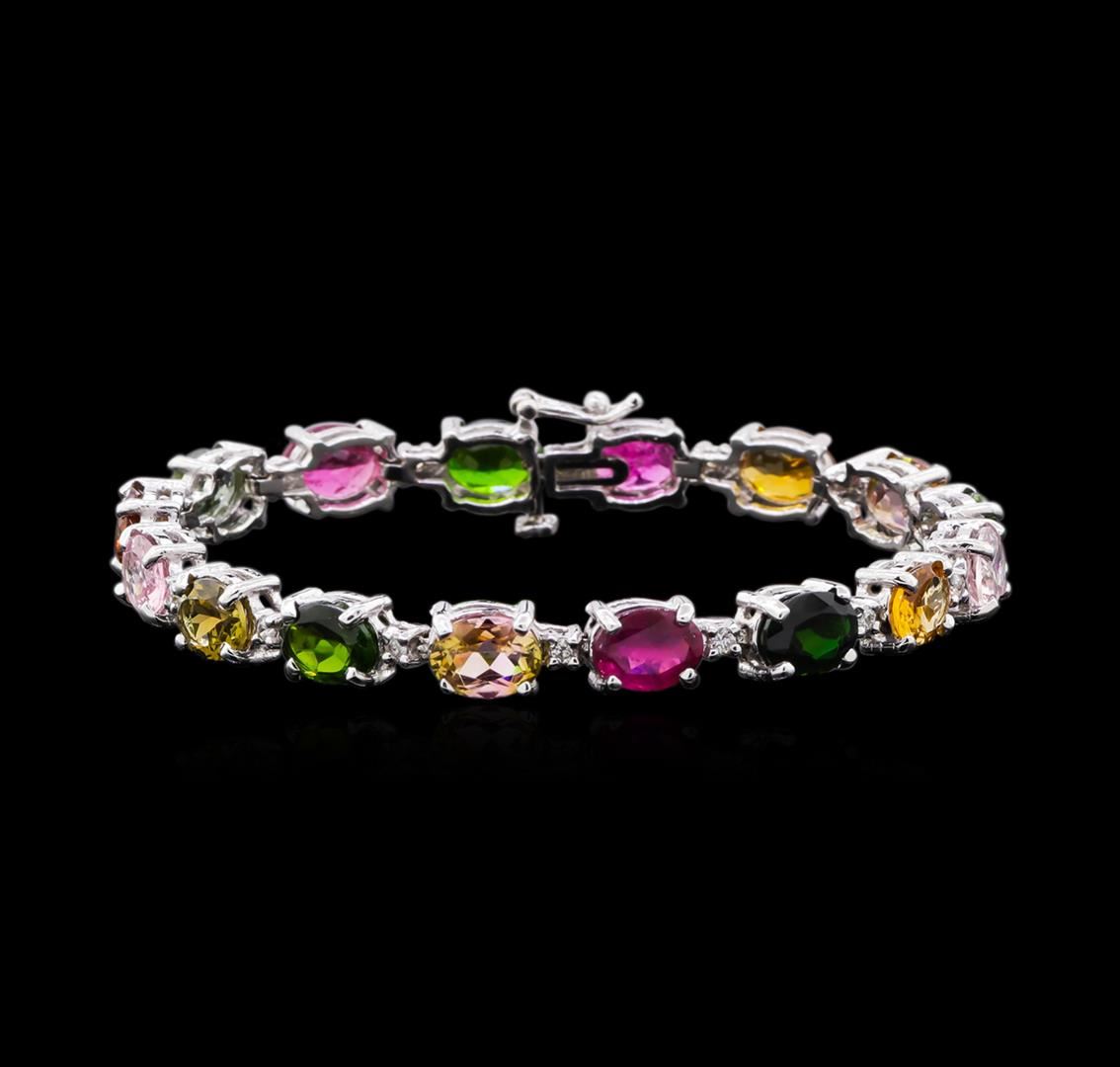 One electronically tested 14KT white gold lady's combination cast & assembled fashion straight line bracelet with a tongue clasp with foldover safety with a bright polish finish. The featured lady's bracelet measures 7 inches in length. Identified with markings of "14K". Condition is new, good workmanship. Containing: Sixteen prong set oval modified brilliant cut natural multi-color tourmalines, measuring 8.12 x 7.50 x 3.50mm, (depth est.) approximate total weight of 18.25ct., clarity is moderately included, cut is good. The featured lady's bracelet has a mix of tourmaline from green to orange to orangish yellow to very light pink to pink. Transmitting light somewhat diffusely, transparent to translucent. Colored gemstones are presumed to have been subjected to commonly used enhancement processes. Graded in the setting. Sixteen prong set round brilliant cut diamonds, measuring 2.00 - 1.95 x 1.19mm (depth est.) approximate total weight of 16 Stones = 0.45ct. Graded in the setting. Clarity: SI-1 to SI-2. Color: H - I. Cut Good. Total Weight of Colored Stones 18.25ct. Total Weight of Diamonds 0.45ct. Total Weight of Straight Line Bracelet 17.30gm. GAS Appraised at $4,895.00.
