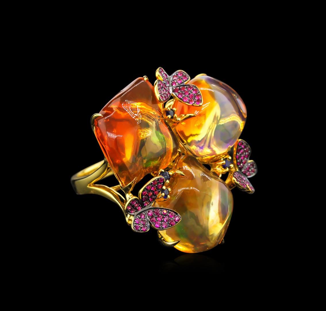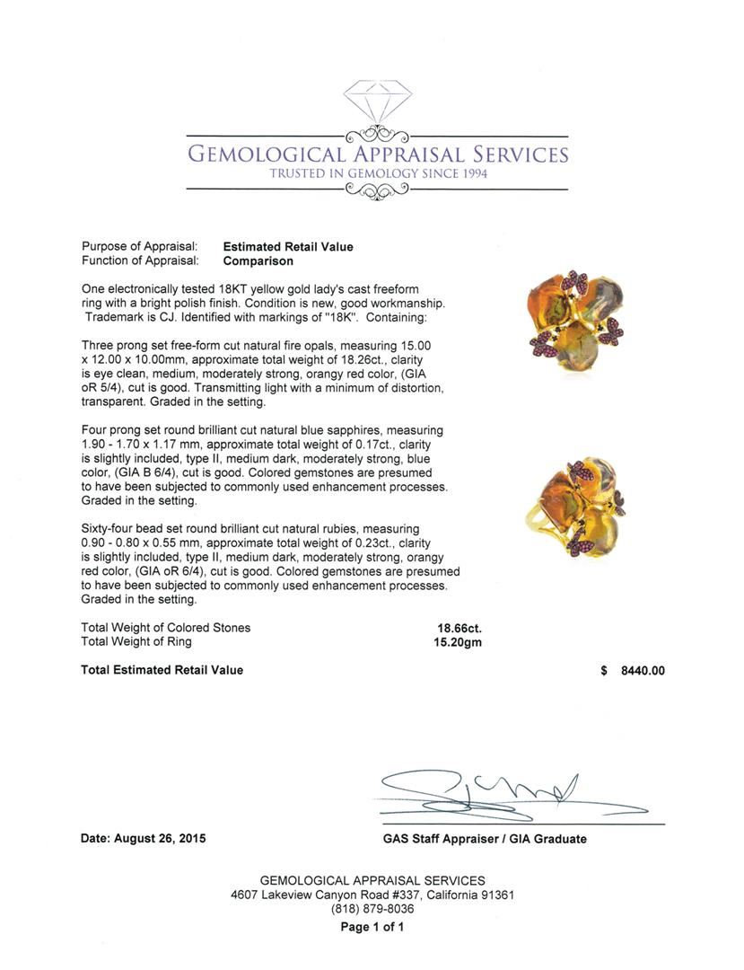 One electronically tested 18KT yellow gold lady's cast freeform ring with a bright polish finish. Trademark is CJ. Identified with markings of "18K". Condition is new, good workmanship. Containing: Three prong set free-form cut natural fire opals, measuring 15.00 x 12.00 x 10.00mm, approximate total weight of 18.26ct., clarity is eye clean, medium, moderately strong, orangy red color, (GIA oR 5/4), cut is good. Transmitting light with a minimum of distortion, transparent. Graded in the setting. Four prong set round brilliant cut natural blue sapphires, measuring 1.90 - 1.70 x 1.17 mm, approximate total weight of 0.17ct., clarity is slightly included, type II, medium dark, moderately strong, blue color, (GIA B 6/4), cut is good. Colored gemstones are presumed to have been subjected to commonly used enhancement processes. Graded in the setting. Sixty-four bead set round brilliant cut natural rubies, measuring 0.90 - 0.80 x 0.55 mm, approximate total weight of 0.23ct., clarity is slightly included, type II, medium dark, moderately strong, orangy red color, (GIA oR 6/4), cut is good. Colored gemstones are presumed to have been subjected to commonly used enhancement processes. Graded in the setting. Total Weight of Colored Stones 18.66ct. Total Weight of Ring 15.20gm. GAS Appraised at $8,440.00.