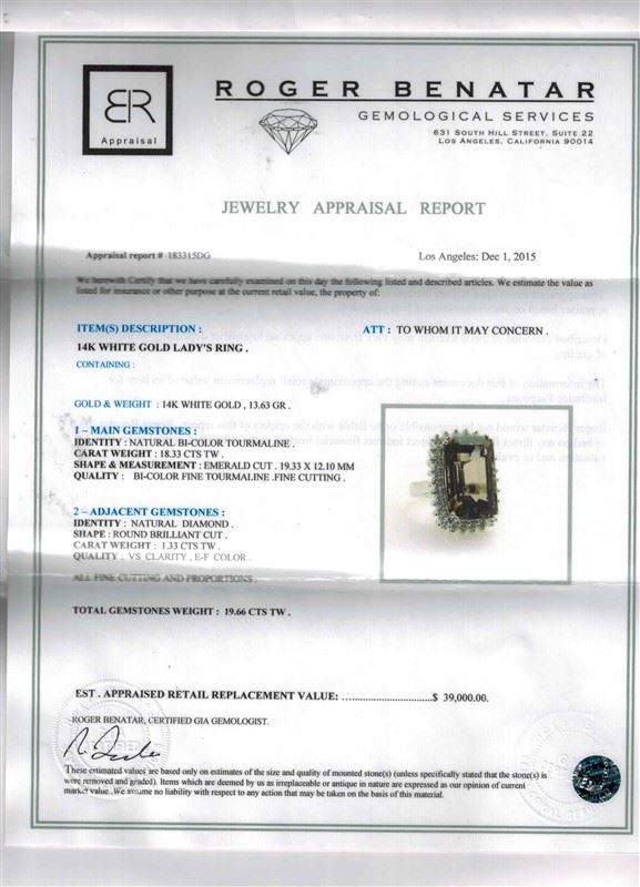 14 K WHITE GOLD BI-COLOR TOURMALINE RING:13.63 GRAMS / BI-COLOR TOURMALINE:18.33CT / DIAMOND:1.33CT / #GVR1560
