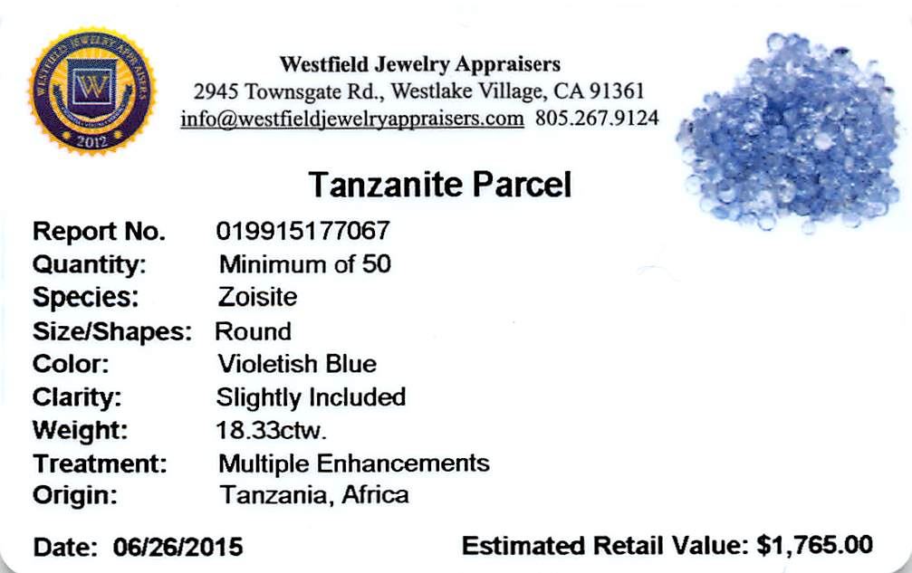 Fifty round mixed cut natural tanzanites, measuring 2.00 - 2.00 x 1.30 mm, exact total weight 18.33ct., clarity is slightly included, type I, medium light, very slightly grayish, violetish blue color, (GIA vB 4/3), cut is good. Measurements & the col Westfield Appraised at $1,765.00.