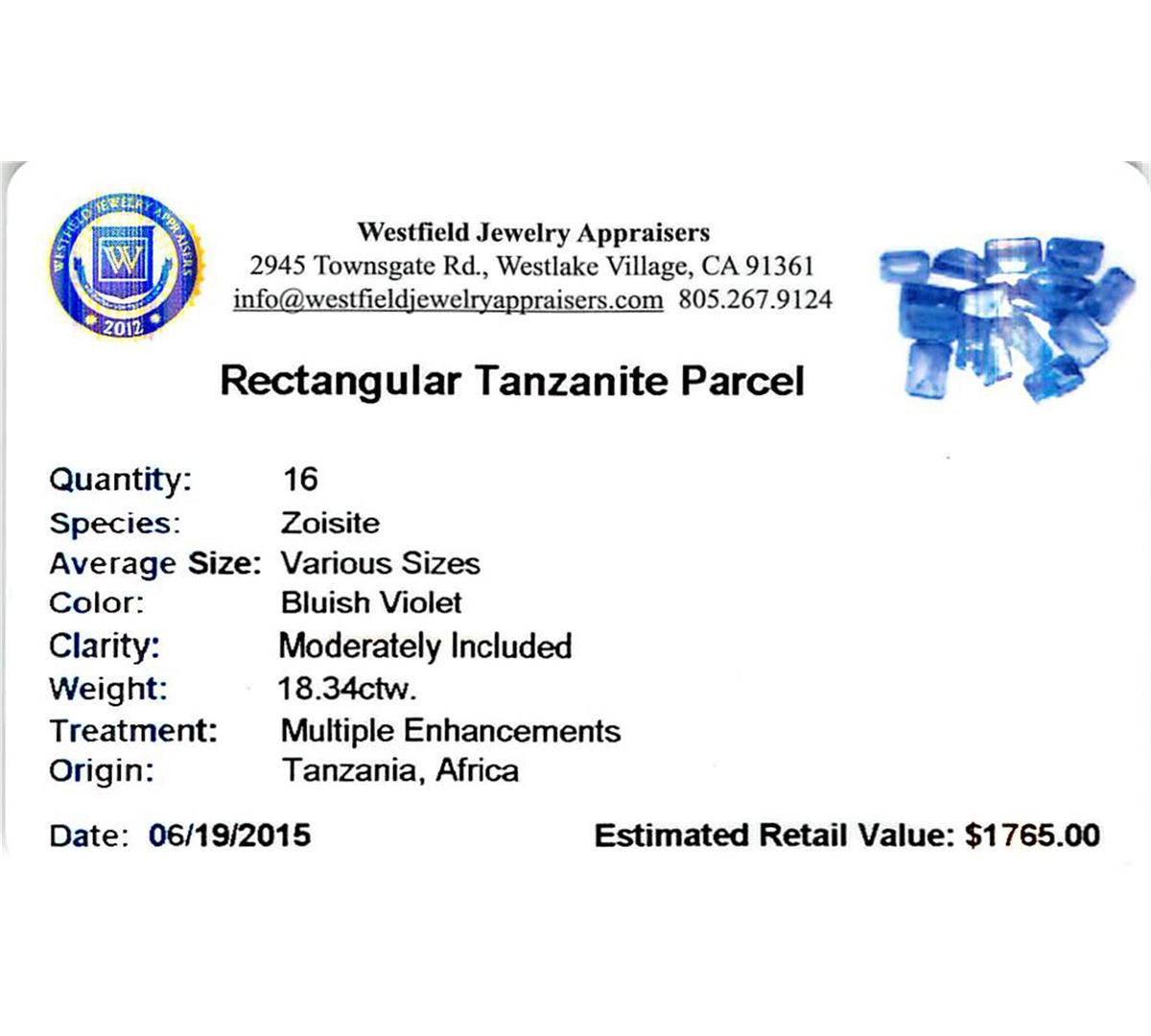 Sixteen rectangular step cut natural tanzanites exact total weight 18.34ct., clarity is moderately included, type I, medium dark, very slightly grayish, bluish violet color, (GIA bV 6/3), cut is good. Transmitting light with a minimum of distortion, transparent. Naturally occurring internal & external characteristics are present. Color grade is an average for the group. Tanzanite is a very rare gemstone that is only found in the country of Tanzania. Originally discovered in 1967. Tiffany & Company, named the stone Tanzanite. It is found in the Usumburu Mountains that border the Umba Valley of northern Tanzania. Tanzanite occurs in gray, brown, violet, blue, reddish-purple, & green. The gem is interesting because of its exceptional pleochroism. Rotated in different directions a tanzanite will exhibit multiple changes of color. Tanzanite has a low tolerance to ultrasonic cleaning, and should not be cleaned using this method. Westfield Appraised at $1,765.00.