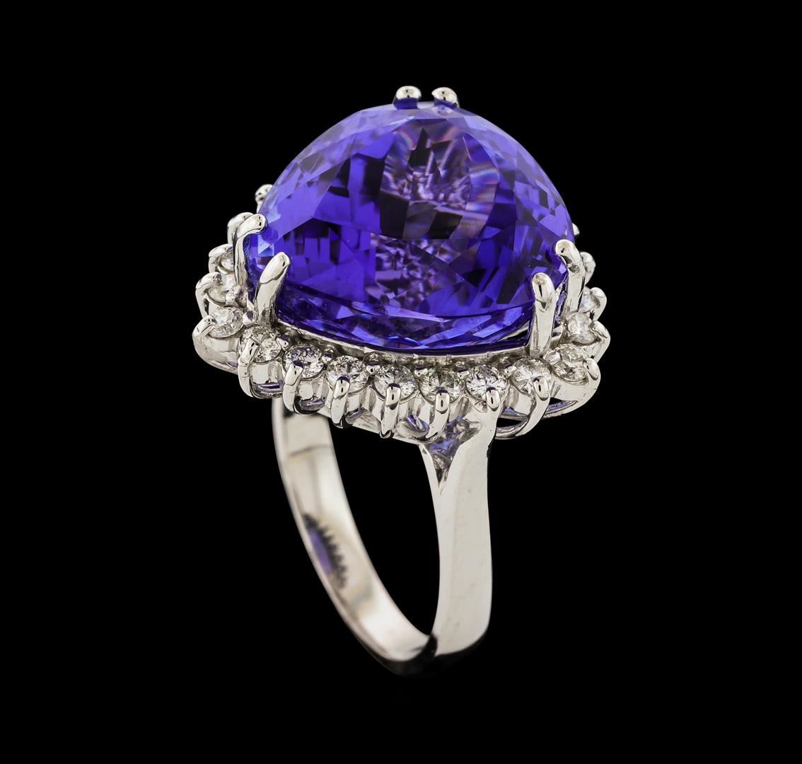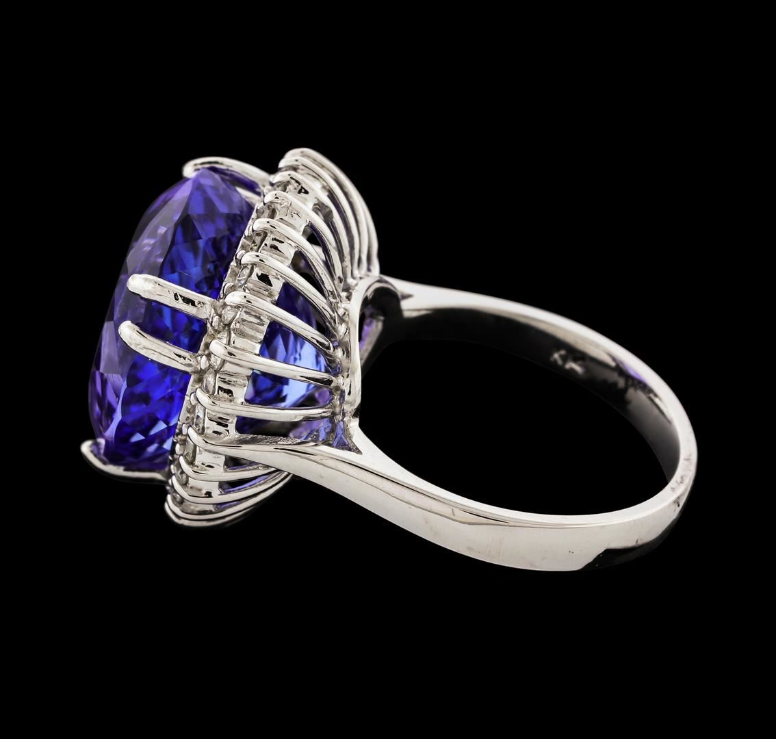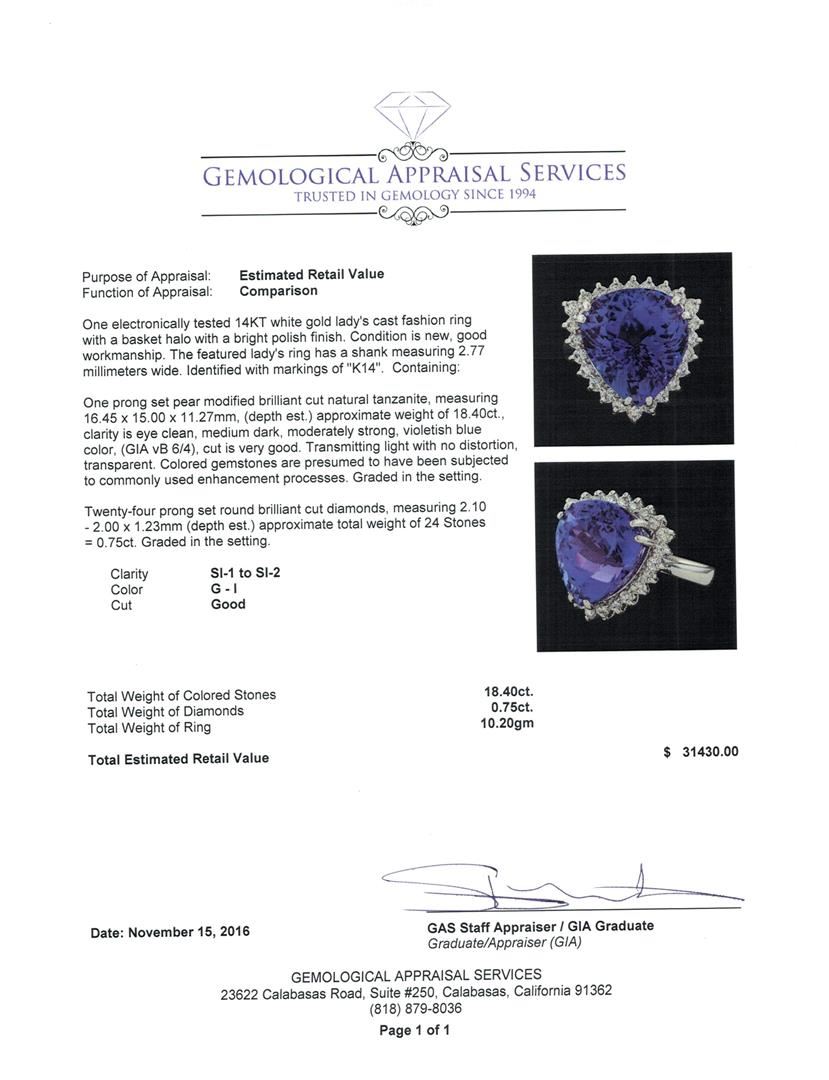 One electronically tested 14KT white gold lady's cast fashion ring with a basket halo with a bright polish finish. The featured lady's ring has a shank measuring 2.77 millimeters wide. Identified with markings of 'K14'. Condition is new, good workmanship. Containing: One prong set pear modified brilliant cut natural tanzanite, measuring 16.45 x 15.00 x 11.27mm, (depth est.) approximate weight of 18.40ct., clarity is eye clean, medium dark, moderately strong, violetish blue color, (GIA vB 6/4), cut is very good. Transmitting light with no distortion, transparent. Colored gemstones are presumed to have been subjected to commonly used enhancement processes. Graded in the setting. Twenty-Four prong set round brilliant cut diamonds, measuring 2.10 - 2.00 x 1.23mm (depth est.) approximate total weight of 24 Stones = 0.75ct. Graded in the setting. Clarity SI-1 to SI-2. Color: G - I Cut Good. Total Weight of Colored Stones 18.40ct.. Total Weight of Diamonds 0.75ct.. Total Weight of Ring 10.20gm. GAS Appraised at $31,430.00.