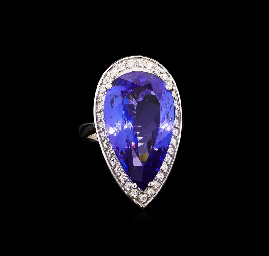 One electronically tested 14KT white gold lady's cast fashion ring with a basket halo with a bright polish finish. The featured lady's ring has a shank measuring 3.28 millimeters wide. Identified with markings of "K14". Condition is new, good workmanship. Containing: One prong set pear modified brilliant cut natural tanzanite, measuring 22.95 x 13.76 x 8.33mm, 4%. bulge factor, approximate weight of 18.42ct., clarity is eye clean, type I, medium, moderately strong, violetish blue color, (GIA vB 5/4), cut is excellent. Transmitting light with no distortion, transparent. Colored gemstones are presumed to have been subjected to commonly used enhancement processes. Graded in the setting. Thirty-Five prong set round brilliant cut diamonds, measuring 1.60 - 1.50 x 0.96mm (depth est.) approximate total weight of 35 Stones = 0.51ct. Graded in the setting. Clarity: VS-2 to SI-1. Color: H - I. Cut Good. Total Weight of Colored Stones 18.42ct. Total Weight of Diamonds 0.51ct. Total Weight of Ring 12.40gm. GAS Appraised at $34,730.00.