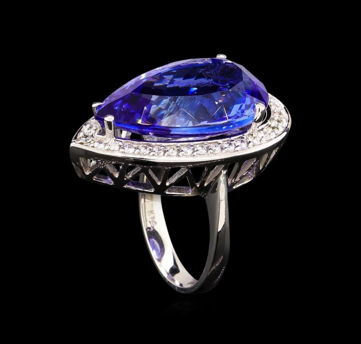 One electronically tested 14KT white gold lady's cast fashion ring with a basket halo with a bright polish finish. The featured lady's ring has a shank measuring 3.28 millimeters wide. Identified with markings of "K14". Condition is new, good workmanship. Containing: One prong set pear modified brilliant cut natural tanzanite, measuring 22.95 x 13.76 x 8.33mm, 4%. bulge factor, approximate weight of 18.42ct., clarity is eye clean, type I, medium, moderately strong, violetish blue color, (GIA vB 5/4), cut is excellent. Transmitting light with no distortion, transparent. Colored gemstones are presumed to have been subjected to commonly used enhancement processes. Graded in the setting. Thirty-Five prong set round brilliant cut diamonds, measuring 1.60 - 1.50 x 0.96mm (depth est.) approximate total weight of 35 Stones = 0.51ct. Graded in the setting. Clarity: VS-2 to SI-1. Color: H - I. Cut Good. Total Weight of Colored Stones 18.42ct. Total Weight of Diamonds 0.51ct. Total Weight of Ring 12.40gm. GAS Appraised.