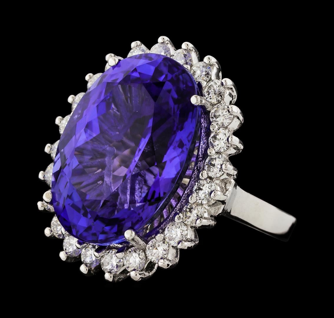 One electronically tested 14KT white gold lady's cast fashion ring with a basket halo with a bright polish finish. The featured lady's ring has a shank measuring 2.48 millimeters wide. Identified with markings of '14K'. Condition is new, good workmanship. Containing: One prong set oval modified brilliant cut natural tanzanite, measuring 18.86 x 13.47 x 9.88mm, (depth est.) 5%. bulge factor, approximate weight of 18.44ct., clarity is eye clean, medium, moderately strong, violetish blue color, (GIA vB 5/4), cut is very good. Transmitting light with no distortion, transparent. Colored gemstones are presumed to have been subjected to commonly used enhancement processes. Graded in the setting. Twenty-Four prong set round brilliant cut diamonds, measuring 2.40 - 2.30 x 1.46mm (depth est.) approximate total weight of 24 Stones = 1.20ct. Graded in the setting. Clarity SI-1 to SI-2. Color: H - I Cut Good. Total Weight of Colored Stones 18.44ct.. Total Weight of Diamonds 1.20ct.. Total Weight of Ring 10.50gm GAS Appraised at $25,190.00.