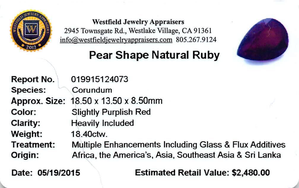 One pear mixed cut natural ruby, measuring 18.50 x 13.50 x 8.50mm, exact weight 18.40ct., clarity is heavily included, type II, dark, very slightly brownish, slightly purplish red color, (GIA slpR 7/3), cut is good. Transmitting light somewhat diffusely, transparent to translucent. Naturally occurring internal & external characteristics are present. Indications of laboratory high temperature heat treatment, with glass & flux additives. Ruby has a low tolerance to rhodium plating, repolishing the surface, & ultrasonic cleaning. Westfield Appraised at $2,480.00.